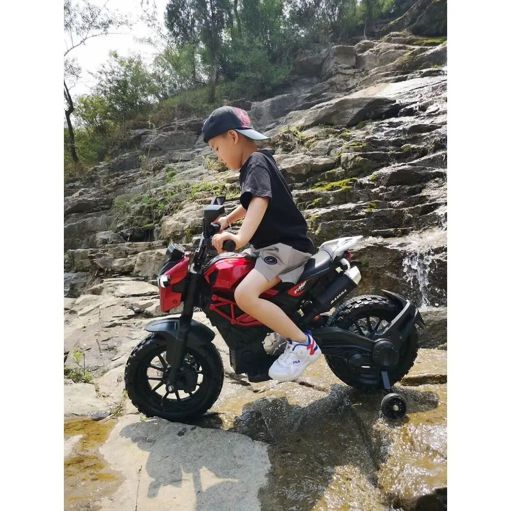 Product Overview:This 12V ride-on motorcycle for kids delivers an exciting and realistic driving experience. With a manual throttle and foot brake, your child will feel the thrill of controlling their speed. The soft PU seat ensures comfort while riding, and the spring shock absorber system provides a smooth ride, even on uneven surfaces. The ride-on motorcycle includes built-in music, stories, and wireless mobile phone connections, adding an educational and entertaining twist. Designed with safety in mind, it features training wheels for stability, making it a great choice for children aged 3 to 6.Product Features:Specifications:Suitable Scenarios:Notes: