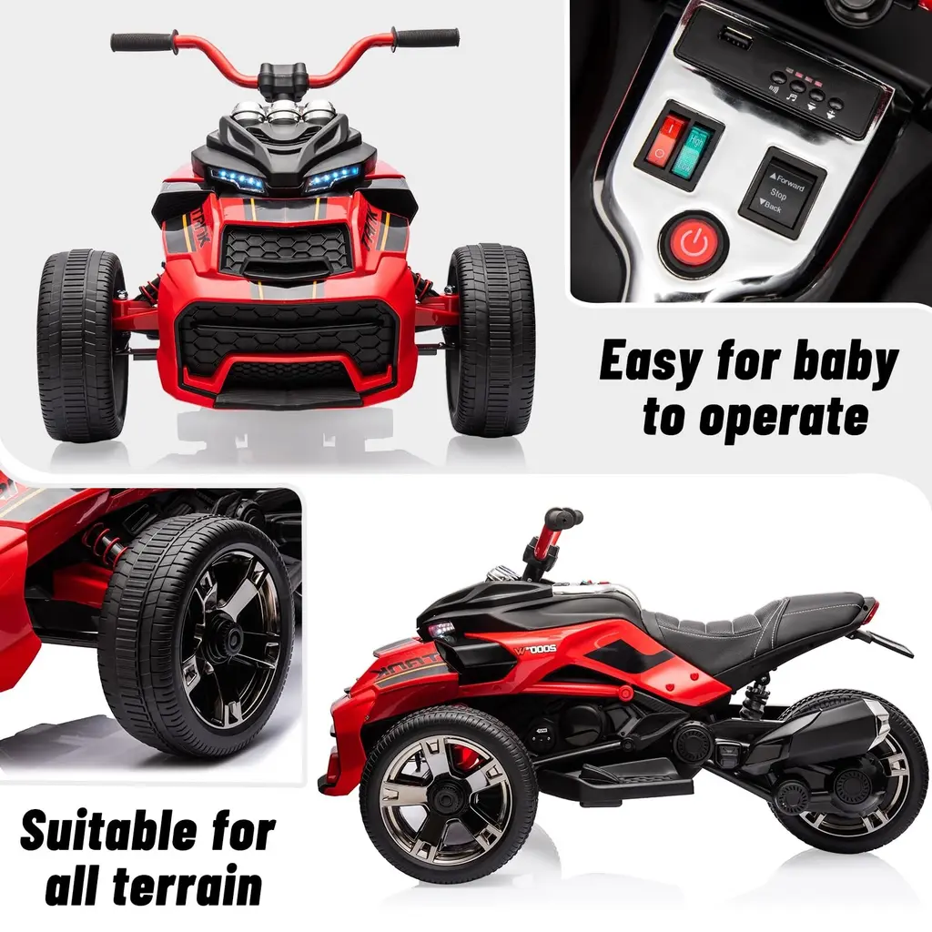 【12V Powerful Engine & 7AH Big Battery】This 3-Wheeler is equipped with 12V/2X55W strong motor which can provide more powerful & stable power in any condition. The fast speed is 7MPH. Give your kids the best driving experience within the safe range. In addition, it is also upgraded to a 7AH large battery, which can provide up to one hours playtime. 【Soft Braking & Suspension System】The customized soft braking system ensures driving safety and virtually no impact on the driver during emergency braking. The suspension system of the four wheels provides better shock absorption, the bumps on the rough road can be significantly reduced. 【Various Entertainment Functions】This ride on ATV has Built-in stories and music And can connect mobile phone to play music, the kids ATV combines educational and entertainment functions to furthest utilize the USB and MP3 port to while kids are driving. And headlight is capable of bringing bright in darkness. Power display reminds you to get it charged in time. 【Wear-Resistant Wheels for All-Terrain Drive】Equipped with wear-resistant wheels, the kids 4 wheeler allows your little ones to ride on nearly all terrain, such as beach, rubber track, cement road and more. Either indoors or outdoors, your kids can enjoy themselves everywhere they want. Besides, 4 wheels featuring large diameter are supposed to support your toddlers with great stability. 【SPECIFICATIONS】Motor: 12V 2X55W. Battery: 12V7AH. Speed: 3-7KM/H. Overall size: 44.49*29.13*23.62 INCH (L x W x H). Wheel diameter: 12.2 INCH. Maximum Load: 66LBS (30KG). Playtime: 1-2 hours. Charging time:8-10 hours. Other Functions: Music/Story Player, LED Lights, Radio, High/Low Speed(Remote).