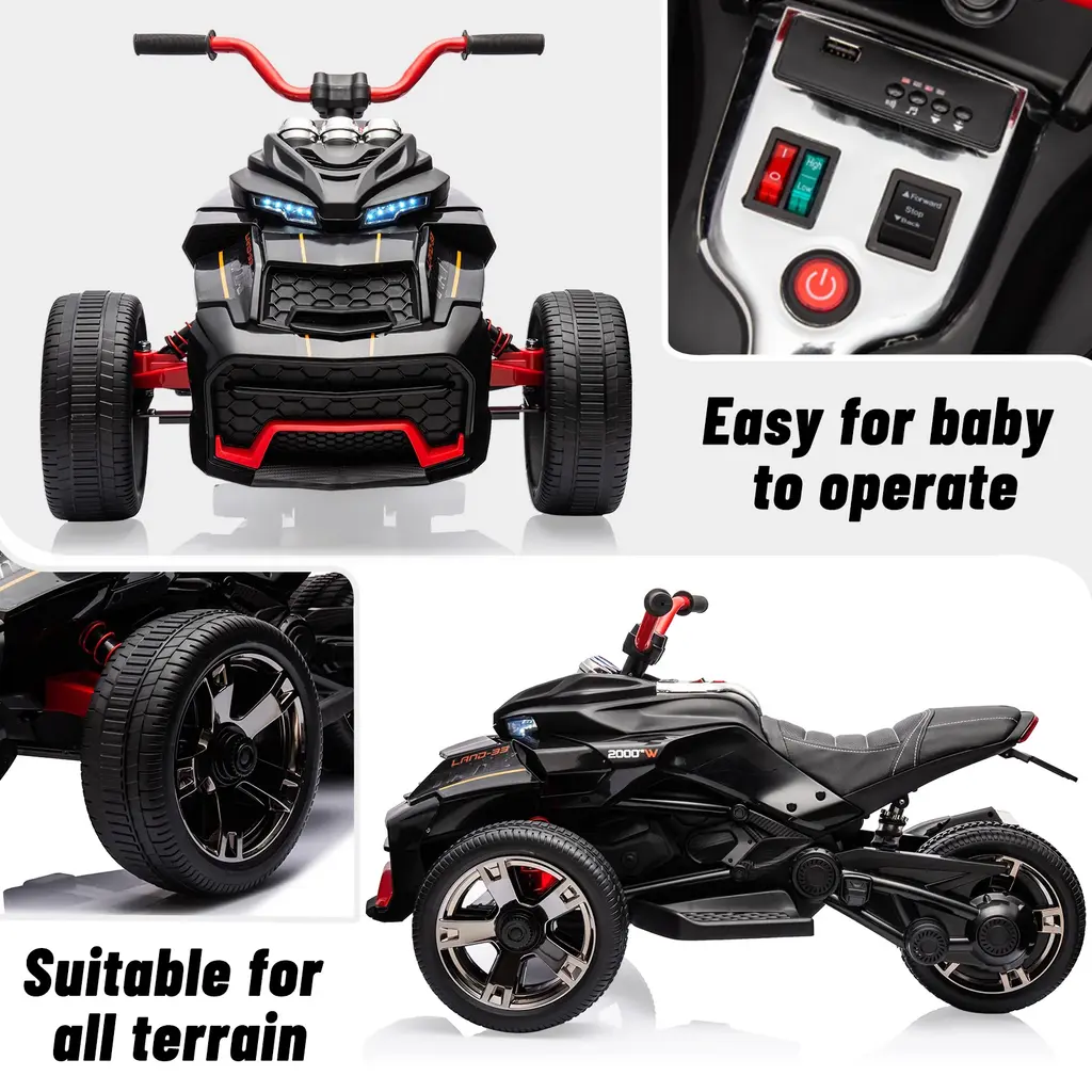 Powerful Performance: The 3-wheeler is equipped with a robust 12V/2X55W motor that delivers stable power in various conditions, achieving speeds up to 7 MPH. With a 7AH large battery, it offers up to one hour of playtime, providing kids with an exciting and safe driving experience.Safety Features: This ride-on ATV includes a customized soft braking system for safe emergency stops, ensuring minimal impact on the driver. The suspension system significantly enhances shock absorption, making it ideal for rough terrain and creating a smoother ride for your child.Entertainment Options: The ATV features built-in stories and music, and it can connect to mobile devices via USB and MP3 ports, allowing kids to play their favorite tunes while driving. Additionally, the bright headlights illuminate paths in low-light conditions, while a power display alerts parents when it’s time to recharge.All-Terrain Capabilities: Designed with wear-resistant wheels, this ride-on ATV can navigate various terrains, including beaches, rubber tracks, and cement roads. The large diameter wheels provide excellent stability for toddlers, ensuring enjoyable rides both indoors and outdoors.Specifications & Functionality: With dimensions of 44.49 x 29.13 x 23.62 inches and a wheel diameter of 12.2 inches, the ATV supports a maximum load of 66 lbs (30 kg). It features options for music/story playback, LED lights, and remote-controlled high/low speed settings, making it a versatile and fun ride for your little ones.