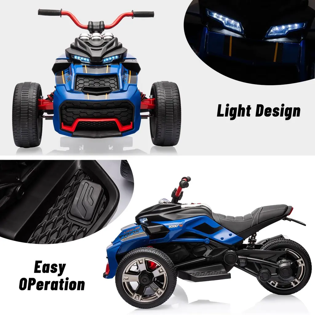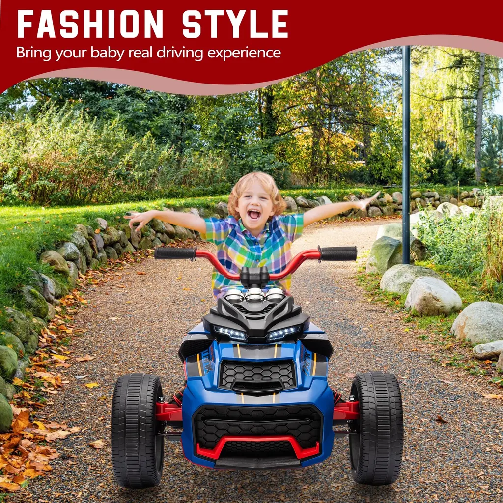 Powerful Performance: The 3-wheeler is equipped with a robust 12V/2X55W motor that delivers stable power in various conditions, achieving speeds up to 7 MPH. With a 7AH large battery, it offers up to one hour of playtime, providing kids with an exciting and safe driving experience.Safety Features: This ride-on ATV includes a customized soft braking system for safe emergency stops, ensuring minimal impact on the driver. The suspension system significantly enhances shock absorption, making it ideal for rough terrain and creating a smoother ride for your child.Entertainment Options: The ATV features built-in stories and music, and it can connect to mobile devices via USB and MP3 ports, allowing kids to play their favorite tunes while driving. Additionally, the bright headlights illuminate paths in low-light conditions, while a power display alerts parents when it’s time to recharge.All-Terrain Capabilities: Designed with wear-resistant wheels, this ride-on ATV can navigate various terrains, including beaches, rubber tracks, and cement roads. The large diameter wheels provide excellent stability for toddlers, ensuring enjoyable rides both indoors and outdoors.Specifications & Functionality: With dimensions of 44.49 x 29.13 x 23.62 inches and a wheel diameter of 12.2 inches, the ATV supports a maximum load of 66 lbs (30 kg). It features options for music/story playback, LED lights, and remote-controlled high/low speed settings, making it a versatile and fun ride for your little ones.
