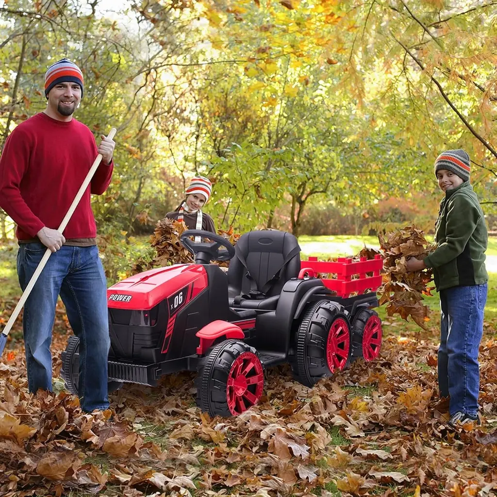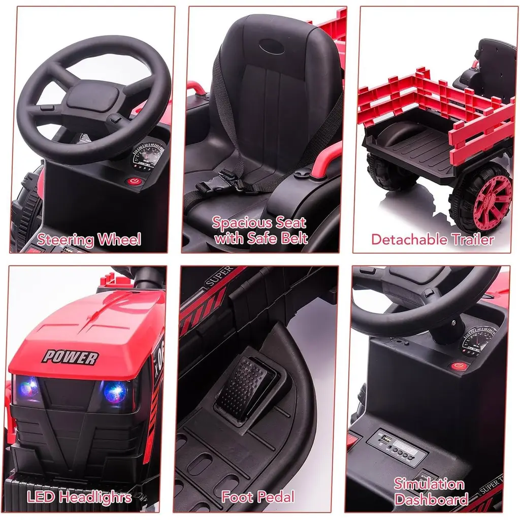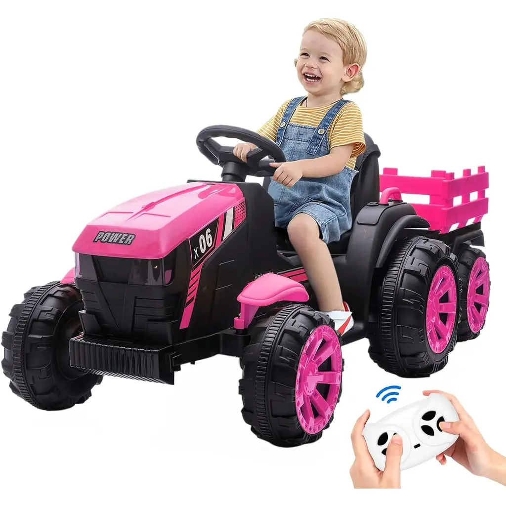 Safety Features: The 12V Kids On Tractor prioritizes safety with a secure belt designed to keep your child safe during rides. Additionally, parents can use the remote control feature to supervise and control the vehicle's movements, ensuring a secure and enjoyable riding experience.Detachable Trailer: This ride-on tractor comes with a functional detachable trailer that allows children to haul toys, snacks, or garden supplies around their backyard or pretend farm. This feature enhances imaginative play, encouraging creativity and exploration during outdoor adventures.Color Variety: Available in five vibrant colors—green, black, red, pink, and yellow—children can choose the tractor that best reflects their personality and preferences. Whether they prefer a classic look or a bold pop of color, there is a perfect option for every child.Powerful Performance: Equipped with a 12V battery and 35W dual motors, this ride-on tractor delivers a smooth and thrilling driving experience. It features high and low-speed settings, along with forward and reverse gears, allowing children to navigate various terrains and enjoy exciting rides.Realistic Design: Designed to resemble a real tractor, this ride-on vehicle includes detailed features such as LED headlights and an interactive console with a horn and music. These realistic elements enhance the imaginative play experience, allowing children to feel like they're truly driving a genuine tractor.