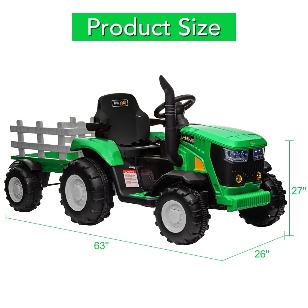 [ Detachable Trailer ] Includes a detachable trailer that can not only store some small toys and snacks but also allow kids to drive in the backyard or garden and carry tools and garden supplies for more fun. [ Outstanding Performance ] Benefited from a premium rechargeable battery with a large capacity and two powerful motors of 35W, this toy tractor can be driven fast even on complex terrains like grass, dirt, and gravel for a long time, bearing a maximum load of 66LBS. [ Premium Materials & Outstanding Performance ] Made of high-quality PP and iron, this ride-on tractor is sturdy and durable with a long service life. In addition, thanks to a large-capacity rechargeable battery and two powerful motors, our ride-on car will provide your kids with many miles of riding enjoyment. [ 3-Gear System ] Give your little one a hands-on driving experience. After pressing the start button, children can independently drive the ride-on toy car forward using the two gears and also steer it backward with low-speed gear. [ Built-in Fun ] Horns powered by air pressure make for cool sounds, while Bluetooth wireless technology and MP3 systems allow you to play your kids’ favorite music or story. Comes with a rechargeable battery with a charging time of 8-12 hours.