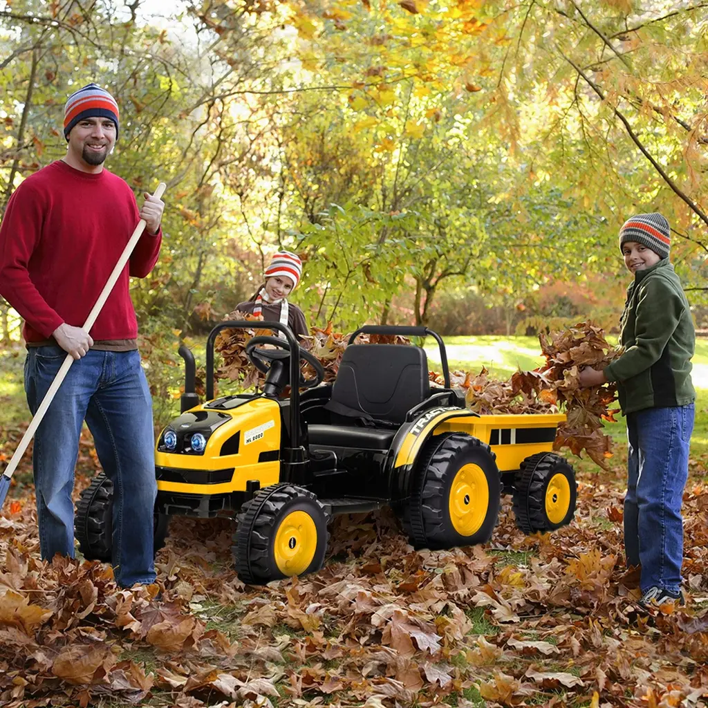 Immersive Sound Experience: The tractor includes MP3 compatibility and multi-functional music effects, providing children with a dynamic auditory experience during their playtime adventures. This integration of music enhances the interactive nature of the driving experience, creating a more engaging and immersive play atmosphere. Versatile Trailer Inclusion: Accompanied by a trailer, this tractor allows children to expand their imaginative play by transporting items and engaging in various activities. The trailer enhances play possibilities, encouraging creativity and enabling kids to create a wide range of imaginative scenarios during their adventures. Cutting-Edge 2.4G Remote Control: The ride-on tractor features an advanced 2.4G remote control system that ensures precise and convenient navigation. This functionality allows parents to guide and supervise their child's playtime, providing peace of mind while ensuring a safe and enjoyable experience for young drivers. Enhanced Stability with Rear Wheel Suspension: Designed with rear wheels that feature suspension, this tractor offers a smooth and stable driving experience, especially on uneven or rough terrain. This stability ensures that young drivers enjoy a comfortable and secure ride, enhancing their overall enjoyment during playtime. Vibrant LED Lights: Equipped with eye-catching LED lights, the tractor illuminates the play area and enhances the authenticity of the driving experience. These vibrant lights not only add excitement to playtime but also improve visibility during outdoor adventures, contributing to a safer and more enjoyable driving experience for children.
