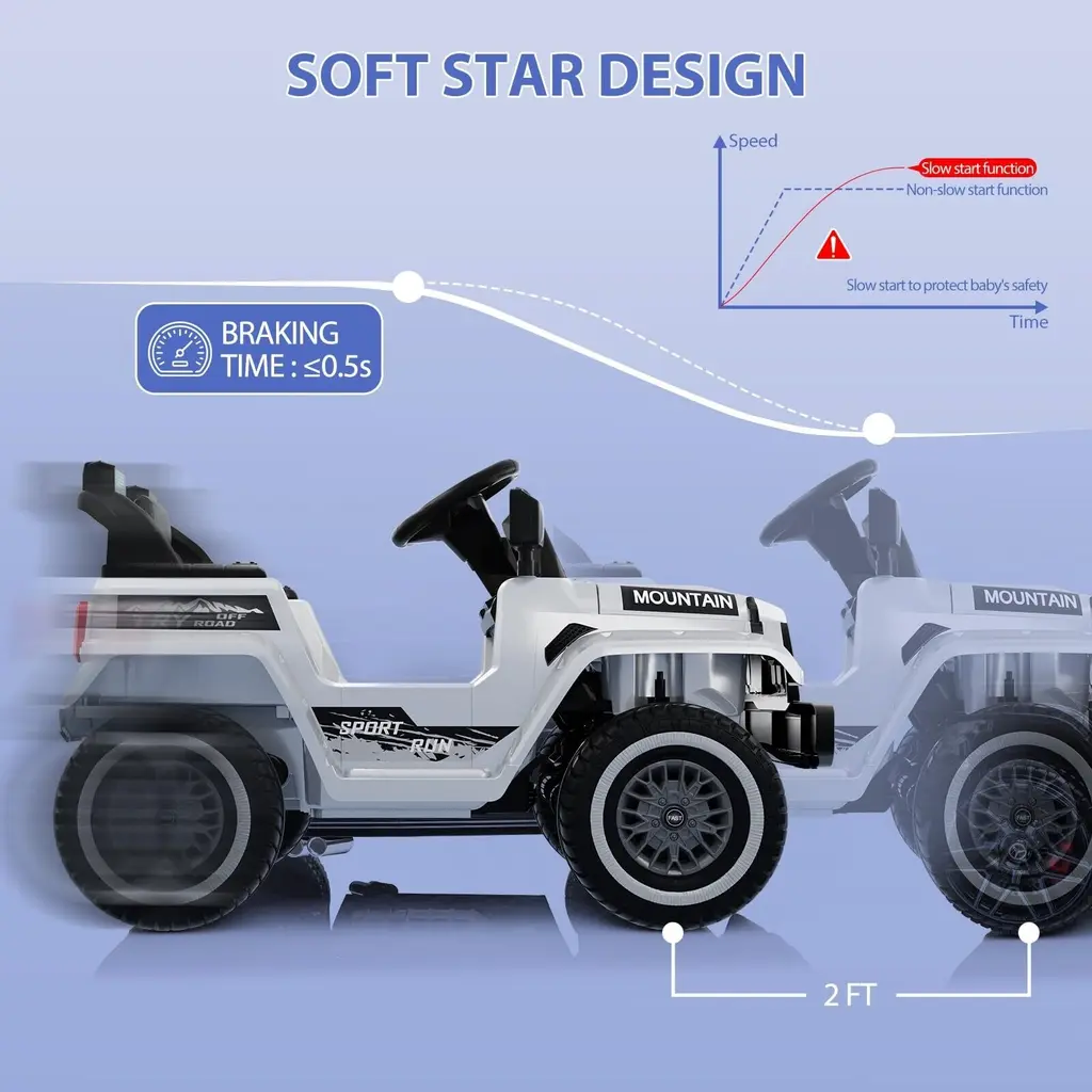 【Two Modes Design】1. Parental remote control mode: You can control this ride on truck through remote control to enjoy the happiness of being together with your baby. 2. Battery operate mode: Children will be proficient in using pedal and steering wheel to operate their own electric toys. 【Attractive & Fun Function】With forward and reverse functions and three speeds on remote control for adjustment, children will gain more autonomy and entertainment during play. Equipped with MP3 player, AUX input, USB port & TF card slot, this electric truck is able to be connected to your device to play music or stories. This not only provides early education for kids, but also makes driving enjoyable. 【Soft Start & Security Assurance】Anti slip and wear-resistant wheels with shock absorber ensure smooth and steady driving on the wood floor, brick road or cement road, which gives kids more outdoor driving options. It is worth mentioning that soft start technology of the kids ride on car prevents children from being frightened by sudden acceleration or braking. 【RECHARGEABLE BATTERY】The 12V battery powered car is equipped with efficient and stable batteries. Two 35W motors provide sufficient power and long service life. The lower right corner of the steering wheel is equipped with a safe charging hole, which can be plugged into and charged directly for safety upgrade. NOTE: Be sure to read the instructions carefully before use. 【Ideal Ride on Car for Your Kids】Featuring cool outlook and realistic driving functions, our kids ride on toy is a perfect gift for 3+ years old kids. Solid steel and PP materials make it strong and durable enough to accompany your kids for years. OVERALL DIMENSIONS: 38"(L) x 24"(W) x 24"(H); WEIGHT CAPACITY: 66 lbs.