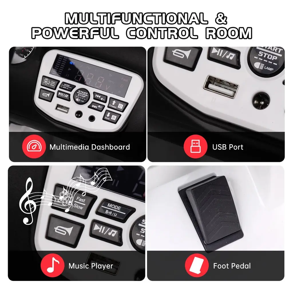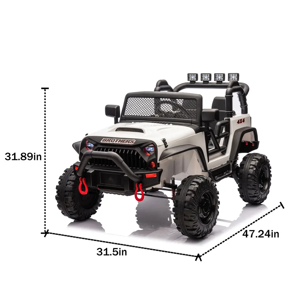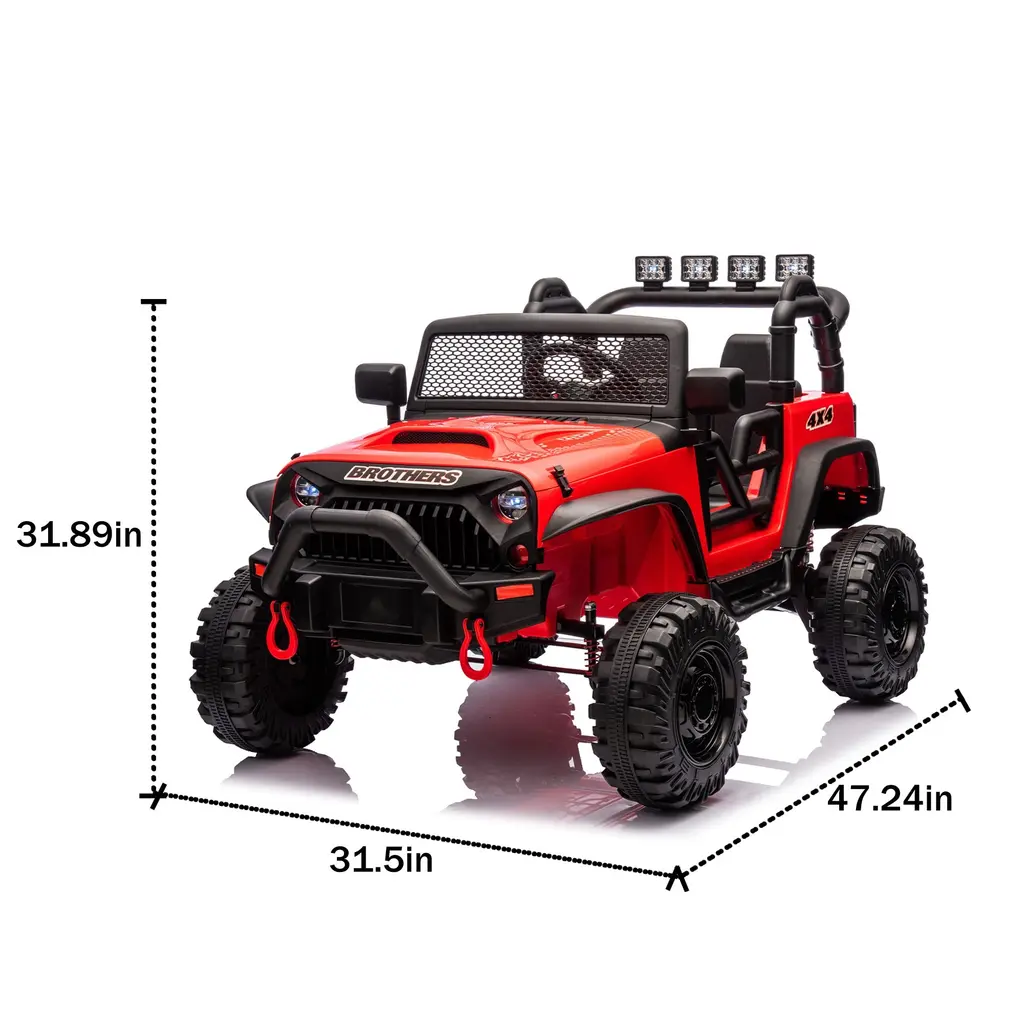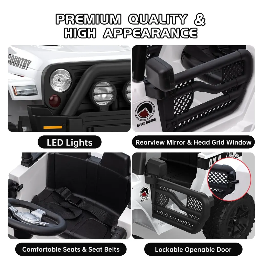 SAFETY & CONTROL: Dual modes of operation allow your child to drive manually for an authentic experience, or you can control it with the parent remote to keep them safe with forward/reverse controls and adjustable seat belts. DESIGNED FOR ADVENTURE: Perfect for ages 3 and up, this kids ride-on truck car lets your child experience driving in a safe and controlled environment with a powerful 12V engine and realistic design that mimics an adult vehicle. REALISTIC FEATURES: With bright LED headlights, lockable doors, and a mesh windshield with an off-road look, this driving car offers a realistic driving experience that kids will love. ALL-TERRAIN PERFORMANCE: Traction tires and a powerful 12V motor make this kid's ride-on truck capable of handling a wide variety of terrain, ensuring that your child's adventures won't end on the sidewalk. ENHANCED SUSPENSION]: The spring suspension system ensures a smooth ride, allowing your little driver to comfortably explore the outdoors in their new ride-on truck vehicle.