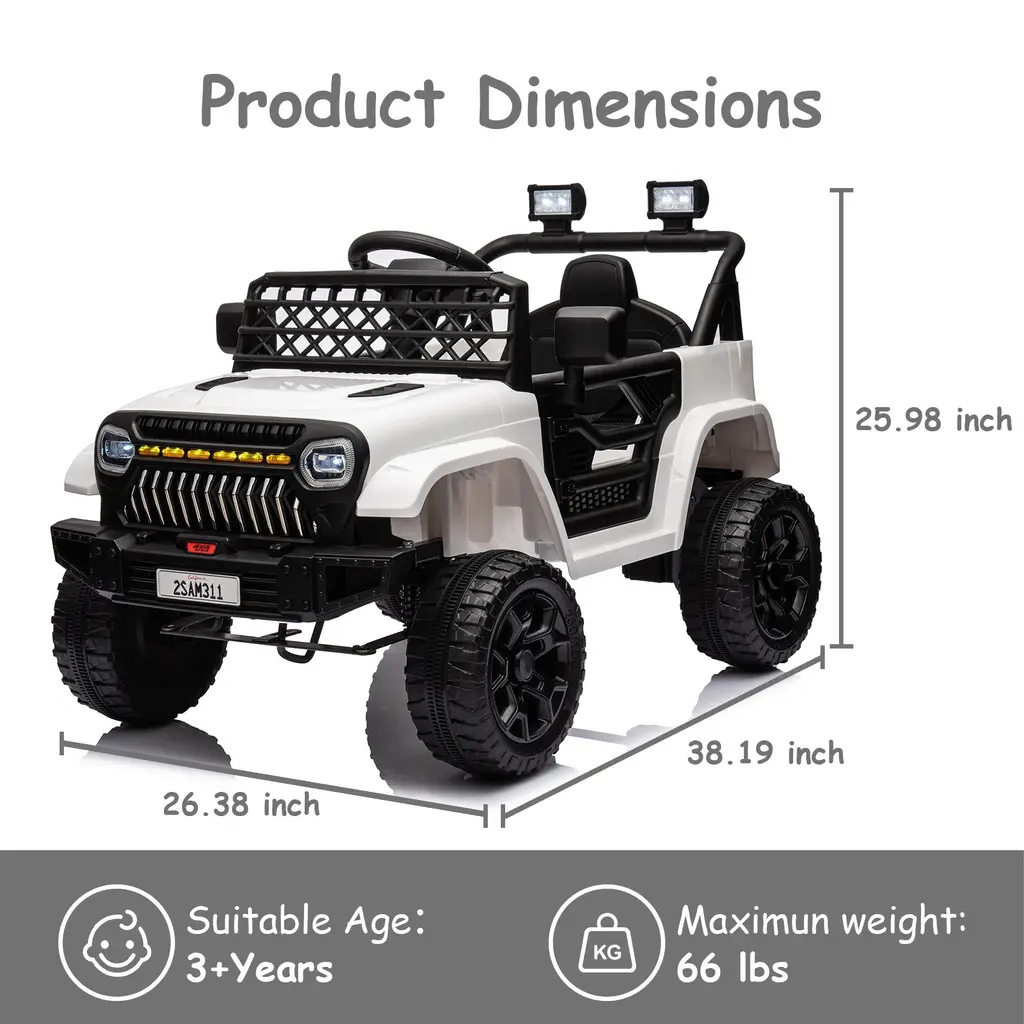 The electric truck features bright LED headlights, lockable doors, and a grid windshield, providing an off-road style for kids to enjoy a realistic driving experience. The easy push-button start and adjustable seat belt ensure safety, while the four stable spring suspension systems offer a smooth and comfortable ride for your child. Equipped with a 12V rechargeable battery and powerful 25W*2 motor, this battery-powered truck offers up to 40 minutes of ride time and strong power. The electric vehicle includes a multi-functional music player with built-in music, MP3, USB, and Bluetooth functions, providing early education for kids and enhancing their driving enjoyment. Parent remote control and child manual operation, suitable for kids of different ages. Children can drive independently using the electric pedals and steering wheel, experiencing the joy of driving, while parents can use the 2.4GHz full-function remote control to control the car's direction and speed, ensuring maximum safety for their children while enjoying quality time together. Made from safe materials, this kids' ride-on truck is suitable for children aged 3 and above with a maximum weight capacity of 66 lbs.