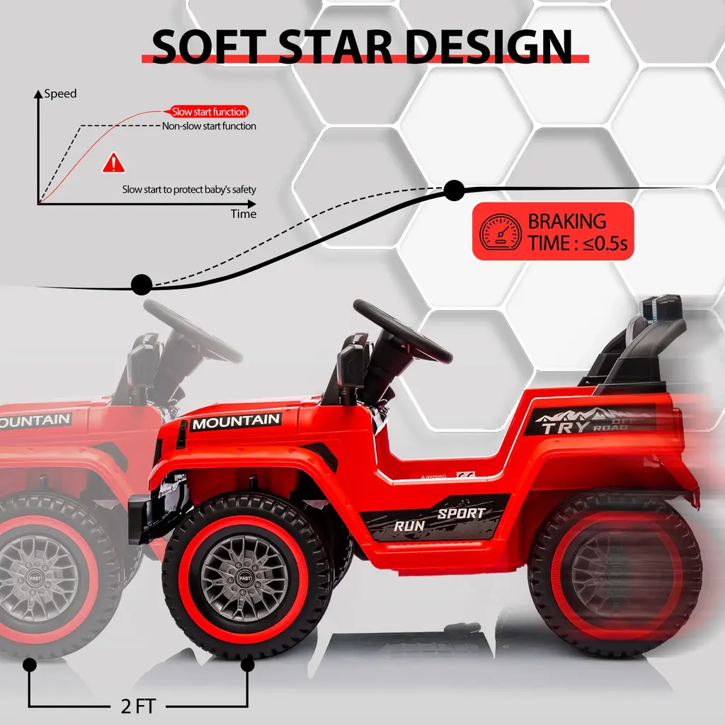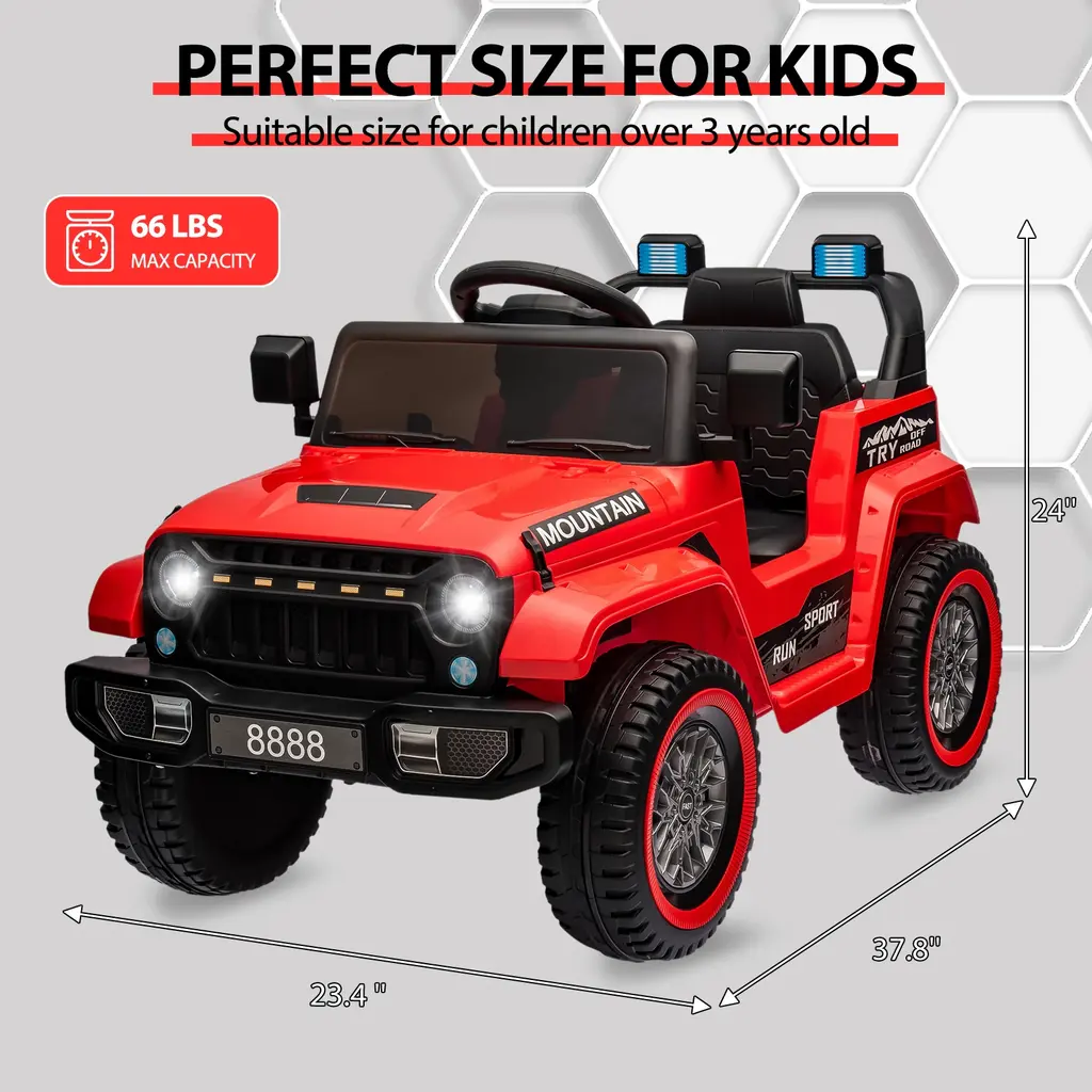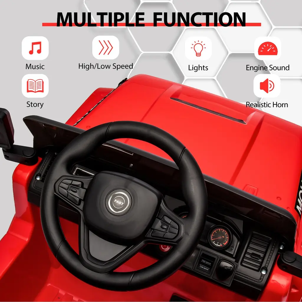 RIDE CAR WITH REMOTE CONTROL: This electric truck has 2 driving modes suitable for kids of different ages. As for younger aged 1-3, parents can use the remote control to operate the electric car, enjoy the time together. For kids aged 3-8, they can operate it by pedal, experience the fun of driving. 12V BATTERY POWERED RIDE TRUCK: This 12V ride on is powered by a 12V rechargeable battery, and driven by 2 x 35W motors, make this kids car provide children with an immersive and realistic experience at speed ranging from 1.25-3.1 mph. MULTI-FUNCTION CONTROL CONSOLE: Easy to start by one start switch. This kids electric vehicle features high/low speed function, music, horn, LED lights, which makes Children can enjoy the rear driving experience with this car. SAFETY FIRST: This ride-on truck has a safety belt that can protect kids during driving. When being in the emergency situation, with the soft brake/start technology and the emergency brake button, it is very perfect to protect the safety of kids. PERFECT GIFT FOR BOYS GIRLS: This 12v ride on toy for kids 3-6 is equipped with multiple functions that can enrich your little one's life and the parent-child relationship, and it can be a surprising gift for your lovely children or grandchildren.