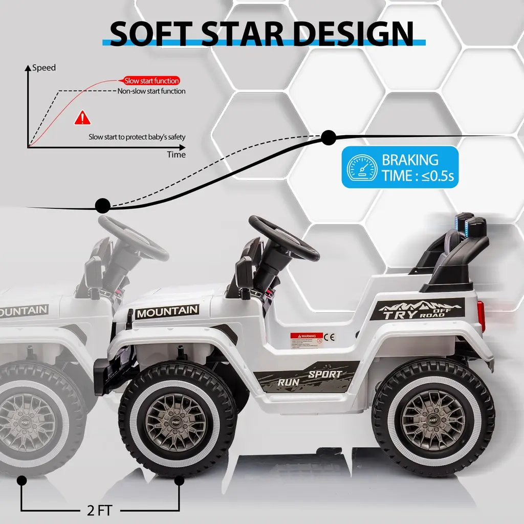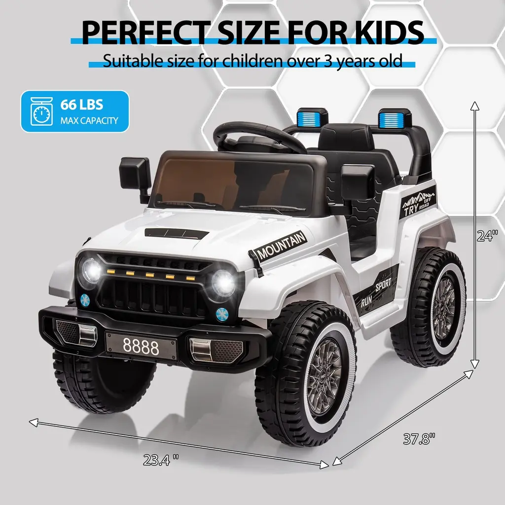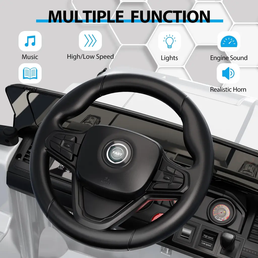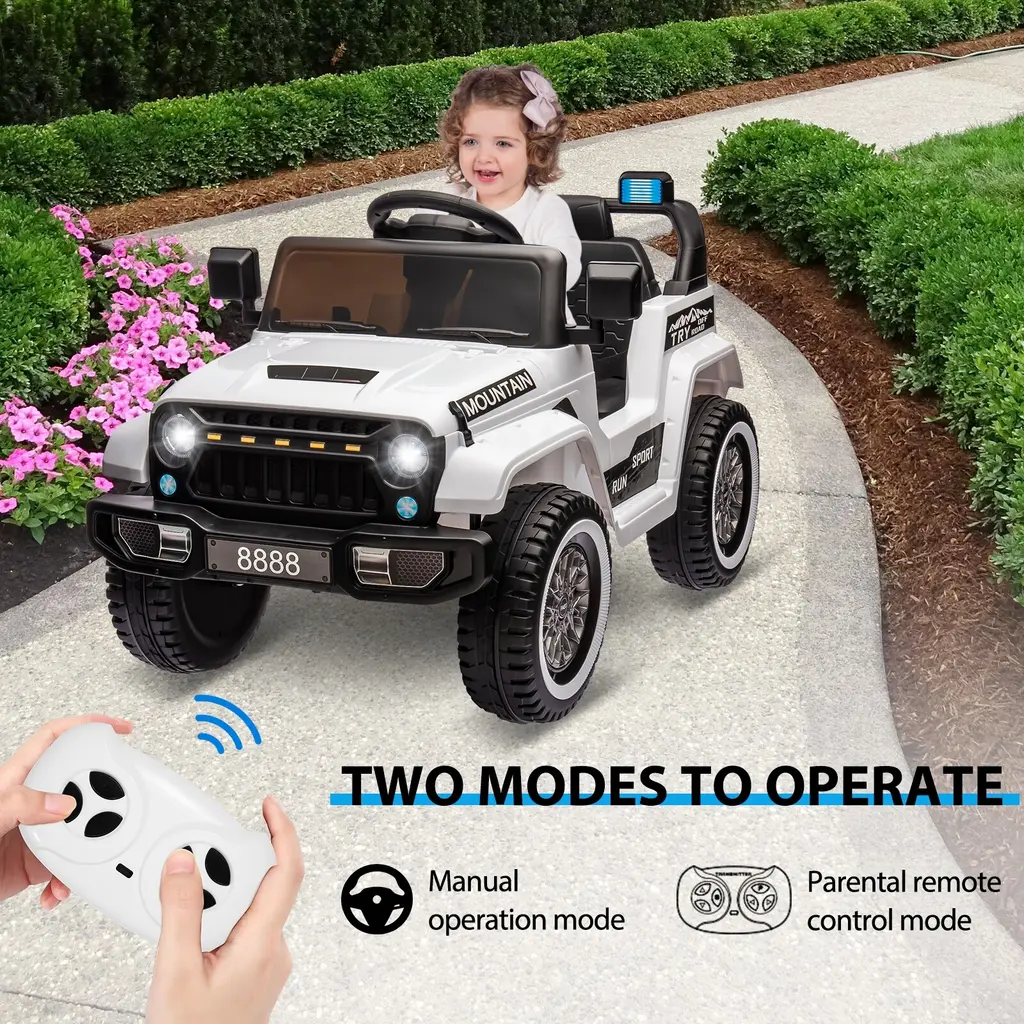 RIDE CAR WITH REMOTE CONTROL: This electric truck has 2 driving modes suitable for kids of different ages. As for younger aged 1-3, parents can use the remote control to operate the electric car, enjoy the time together. For kids aged 3-8, they can operate it by pedal, experience the fun of driving. 12V BATTERY POWERED RIDE TRUCK: This 12V ride on is powered by a 12V rechargeable battery, and driven by 2 x 35W motors, make this kids car provide children with an immersive and realistic experience at speed ranging from 1.25-3.1 mph. MULTI-FUNCTION CONTROL CONSOLE: Easy to start by one start switch. This kids electric vehicle features high/low speed function, music, horn, LED lights, which makes Children can enjoy the rear driving experience with this car. SAFETY FIRST: This ride-on truck has a safety belt that can protect kids during driving. When being in the emergency situation, with the soft brake/start technology and the emergency brake button, it is very perfect to protect the safety of kids. PERFECT GIFT FOR BOYS GIRLS: This 12v ride on toy for kids 3-6 is equipped with multiple functions that can enrich your little one's life and the parent-child relationship, and it can be a surprising gift for your lovely children or grandchildren.