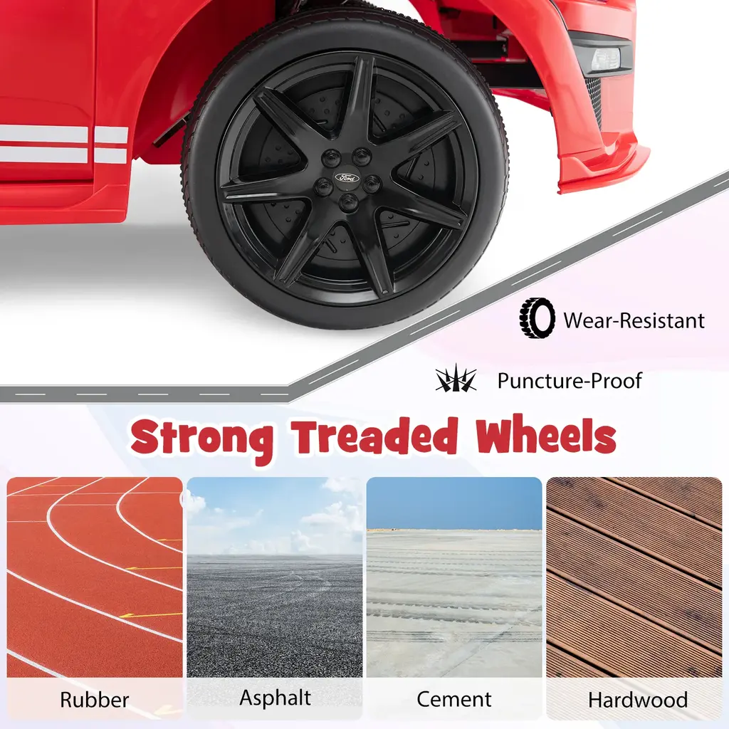 Specifications:Description:Experience the thrill of the ride with this realistic licensed Ford car, featuring 2.4 MPH high speed and 1.1 MPH low speed, a one-button start, and soft start and stop functions for a smooth ride. Equipped with two powerful motors, it’s ideal for young adventurers. The 12V electric toy car includes an attractive media center with a USB port, radio, music player, and realistic horn and engine sounds for added fun. It offers both manual and parent-controlled operation, with a 2.4G remote control, an adjustable safety belt, and secure lockable double doors for safety. Designed for easy use, the car features a battery display, volume button, light bar switch, speed button, direction lever, and pedal. The wear-resistant, puncture-proof treaded wheels make it suitable for various surfaces, and the 12V 7AH battery provides 1-2 hours of playtime. With functional rear view mirrors and bright LED lights, this ride-on car is perfect for children aged 3-8, making it a fantastic gift that enhances their driving experience.Key Features:
