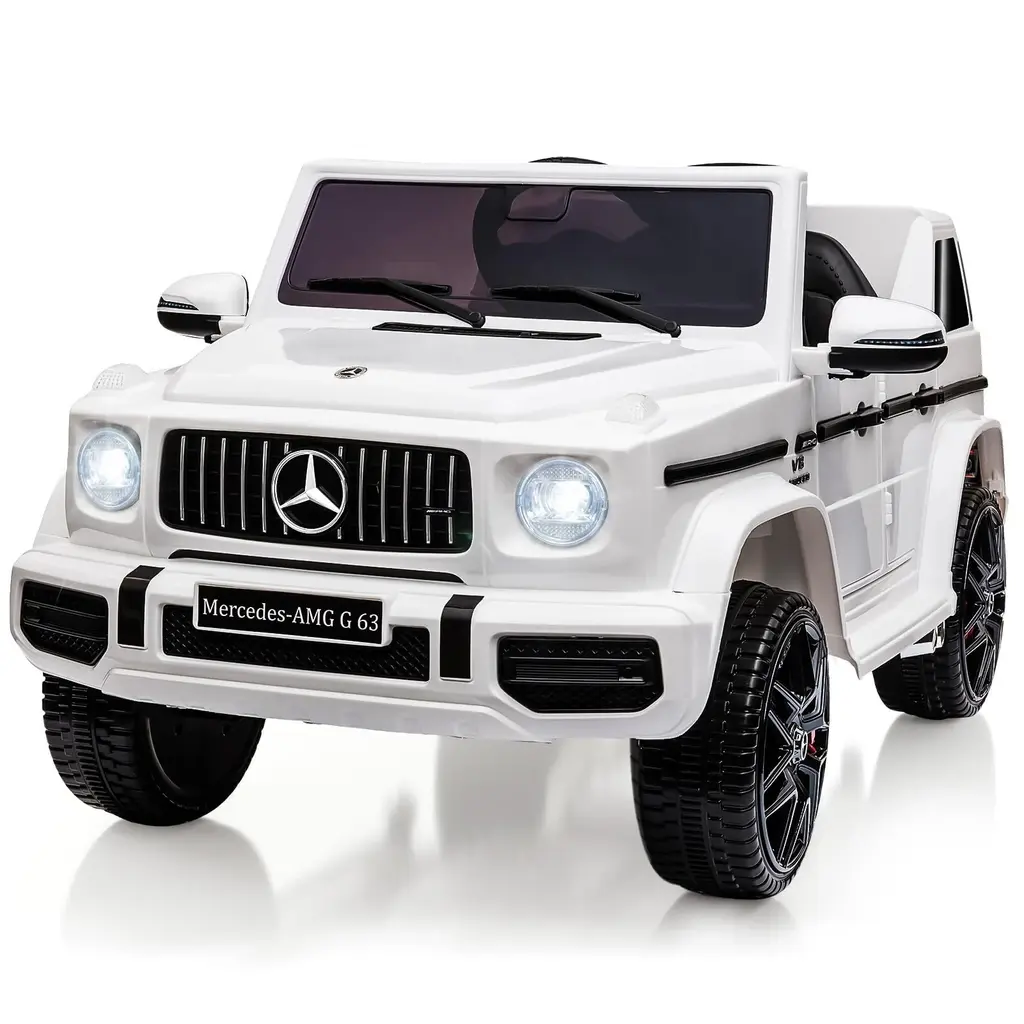 Specifications:Key Features:Description:Kids can not only enjoy the fun of driving through the steering wheel and acceleration pedal but also have a great time with the multiple media functions (FM/Music). The realistic appearance of models from the real Mercedes-Benz G63 gives the kids a real-life feel with a 2-mode light system to intensify the thrill. A 2.4G remote is ready for parents to choose the direction and the speed. And with four-wheel spring suspension system and a slow start system, this car runs smoothly and safely on most of the ground. It is designed for 1 rider under 66 lbs of limitation. And the 12V 4.5A rechargeable battery can last for 50mins.
