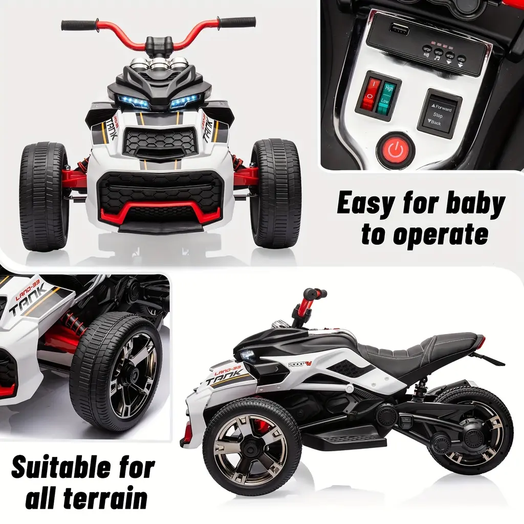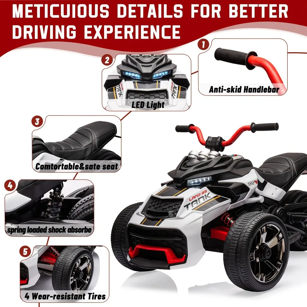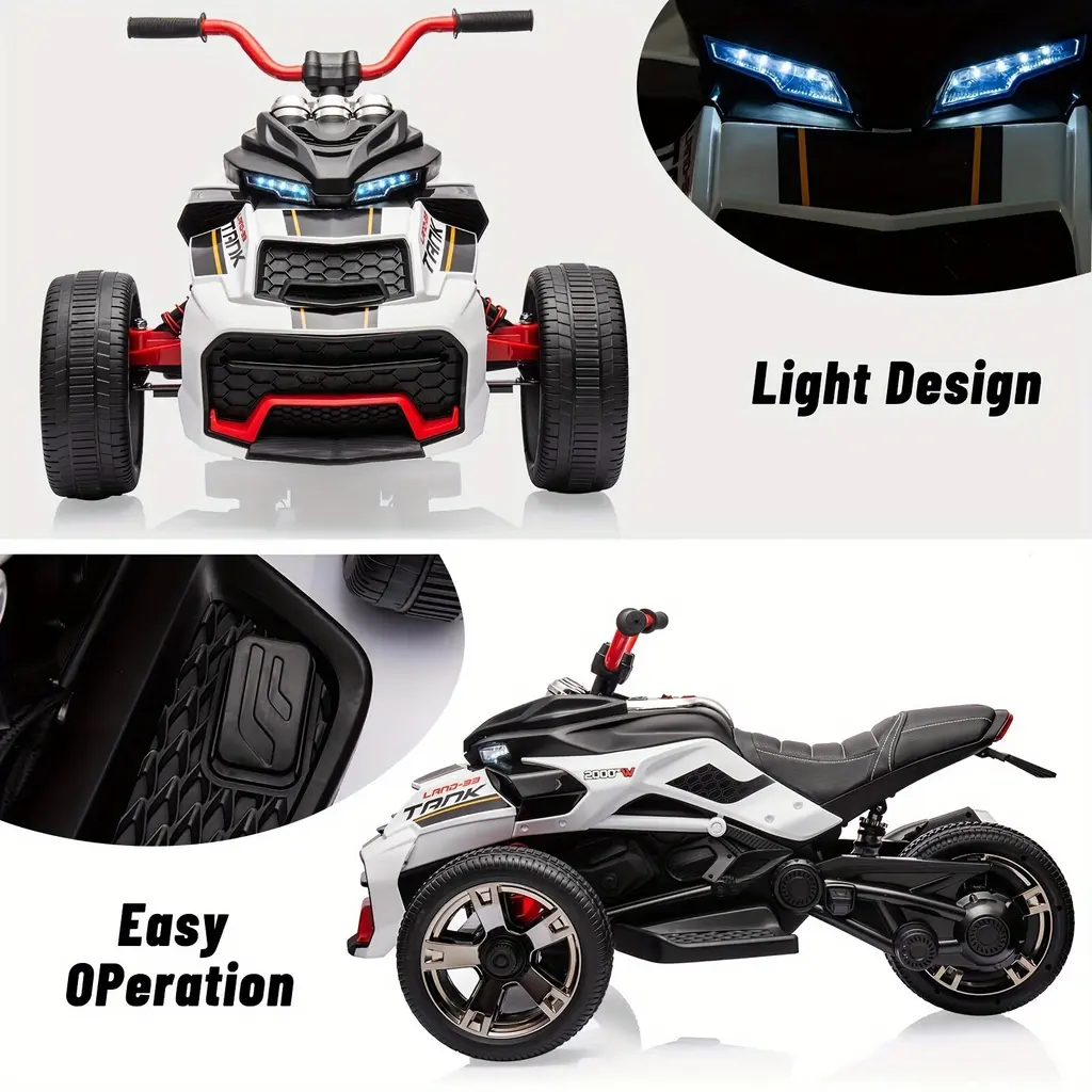 12v Ride-On Atv, 3 Wheel Motorcycle, Battery Powered Atv Toy Vehicle, With Music, Realistic Headlights, White - White