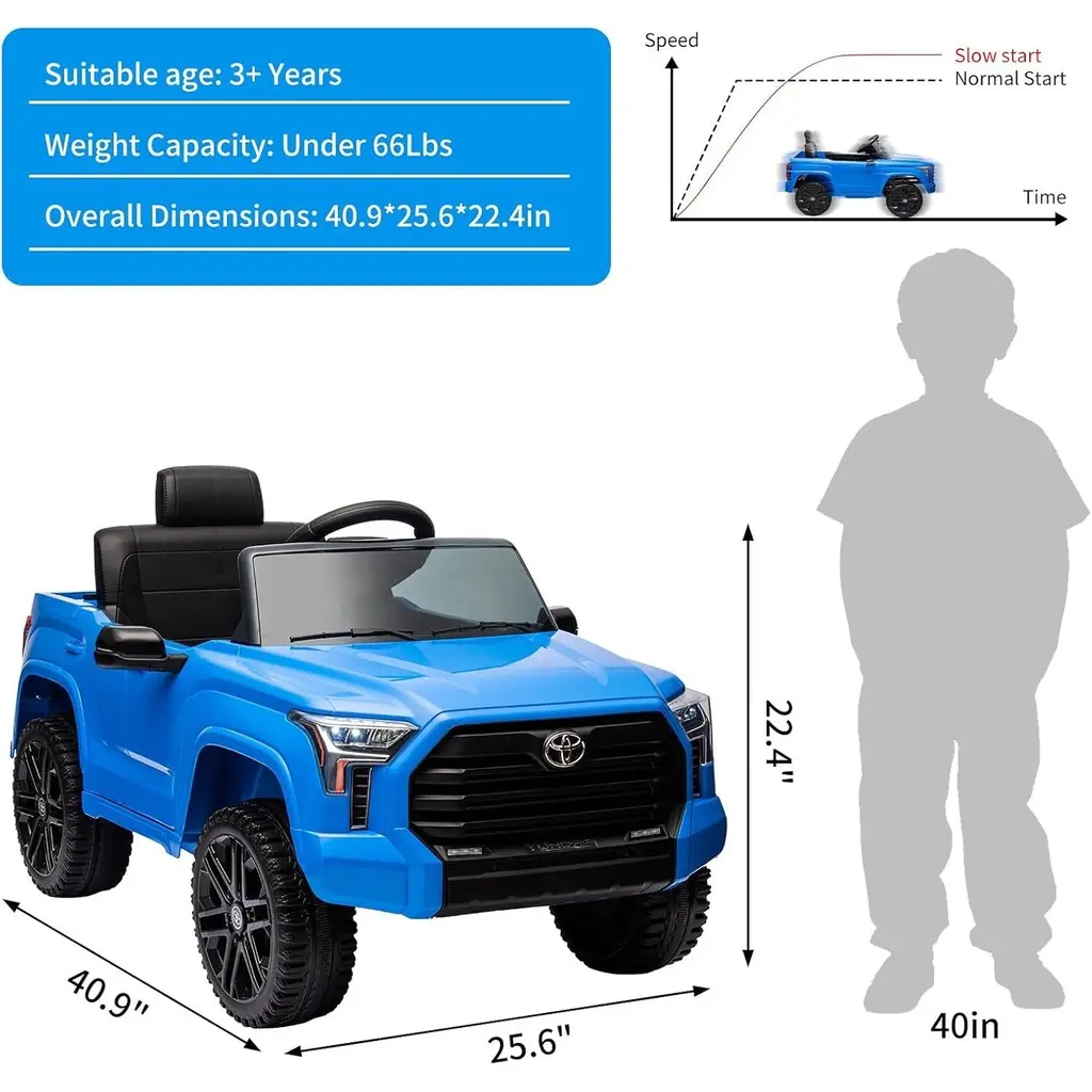 Stylish Design: Officially Licensed Toyota ride ontruck, this ride-on car has a sleek and realistic appearance. It features LED lights, startup sounds, wear-resistant wheels, storage space, an MP3 player, and a flash drive port. The doors fully open and close, adding to the authenticity of the driving experience. Powerful Motor & Suspension: This electric car is powered by a 12V battery and features a robust motor(25Wx2) that allows kids to drive comfortably on various terrains, such as grass, gravel, and slight inclines. The spring suspension system enhances the smoothness and stability of the ride, ensuring a fun and safe driving experience. Safe & Durable: Made from durable materials that meet all child safety standards, this electric car is designed to withstand years of use. Passed CPSIA, CPC and ASTM-F963 certification. The car has undergone testing for stability, asphyxiation, load, and shear, ensuring its reliability and safety. Rechargeable & Long-lasting: The car comes with a rechargeable 12V battery and charger, offering a charging time of 8-12 hours. Once fully charged, kids can enjoy 1-2 hours of playtime. The detachable battery allows for convenient charging separately from the vehicle. The larger seat provides added comfort for children aged 3+ years. The overall dimensions of the car are 40.94"L x 25.6W x 22.4"H. Dual Driving Modes: Children can drive the car themselves by using the foot pedal for acceleration and steering wheel for maneuvering. Alternatively, parents can take control using the 2.4G remote control, which provides forward, reverse, and park controls, steering operations, and 3-speed selection.