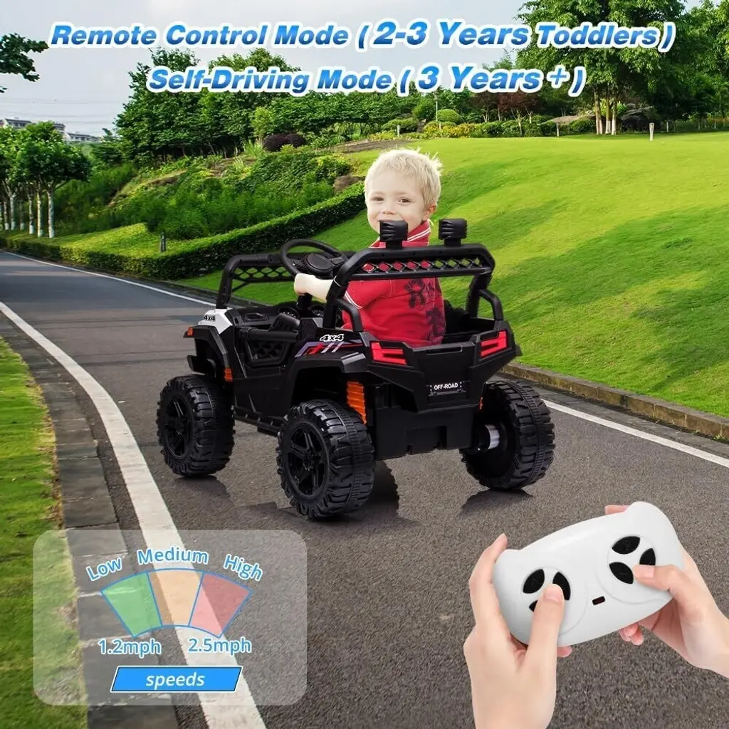 Realistic Design: This UTV features bright LED headlights, control pedals, an optional detachable trailer, realistic engine sounds and horn to provide an authentic and immersive experience. Manual and Parental Control: Parents can enjoy quality time with their child by controlling the tractor, while children can use the foot pedals to operate and control their speed. Built-in Fun: The ride-on vehicle is equipped with an MP3 player, USB port, AUX input, FM radio, and bright LED headlights for added entertainment. Rechargeable Battery: This electric vehicle comes with a 12V 4.5AH battery, with a charging time of 8-12 hours. The overall dimensions suitable for children aged 3-8 years, with a maximum weight capacity of 66 pounds. Safe and Durable: This ride-on car features a slow start function, parental remote priority, adjustable safety belts, lockable doors, and spring suspension wheels to prevent your child from falling. Specifications Dimensions:39.37 x 22.83 x 14.76 inches Item Weight:44.2lbs