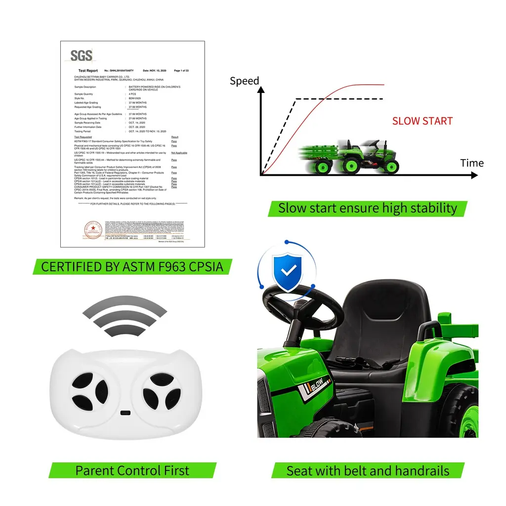 35W/25W EVA Tires Version-- The upgraded version of the ride on tractor has 35W/25W motor,7Ah Battery and EVA tires that are more powerful and shock-absorbing than Tread Tires. It takes only 20 minutes to assemble the car by following the installation video or instruction. Enhanced Performance-- This electric ride on car has a powerful 12V motor and traction tires that enable kids to ride on complex terrains such as grass and gravel. It also has a bright 7-LED headlights, a realistic 2+1 gear shift, adjustable belt,removable trailer for realistic styling. Built-in Entertainment-- The car comes with built-in music, stories,realistic engine sounds, and an air pressure horn that makes funny sounds. It also has a USB port,TF card slot and bluetooth that allow you to connect with your device to play MP3 audio. The dashboard has a battery indicator, making it easy to monitor the battery level. Manual & Parental Control-- The car has both manual and parental remote control options.The car allows kids to operate it by themselves using the foot pedal and steering wheel to choose ideal speeds.Parents can control the vehicle by remote control and enjoy the happiness of being together with more little baby. Safety Guarantee-- The car is certified by ASTM CPSIA and has a slow start function with a kids-friendly design. The car overall dimensions: 54"(L) x 20"(W) x 21"(H), a weight capacity of 66 lbs, and 1-1.5 hours runtime after 8-12 hours full charged.