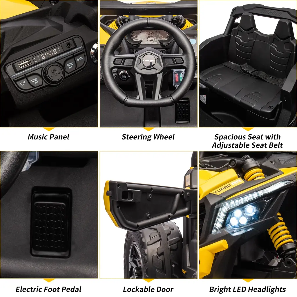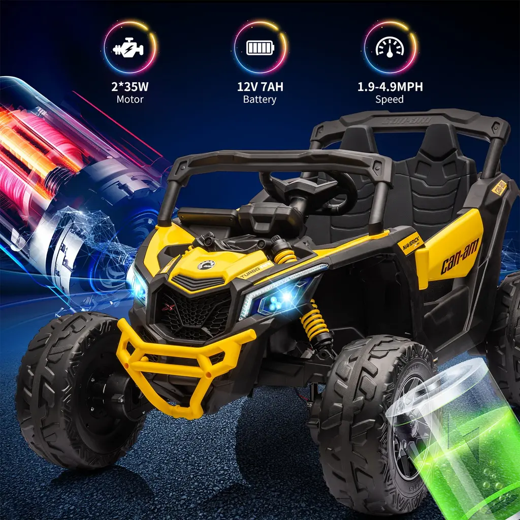 [Powerful Performance]: Equipped with 12V 7AH rechargeable battery. Equipped with spring suspension, this UTV car ensures a smooth and comfortable ride even on rough terrains, providing a realistic driving experience for kids. [12V Licensed Can-Am Ride on UTV Car] : Ride-on UTV car is officially licensed by Can-Am and comes with a remote control.Children can drive the car themselves using the foot pedal for acceleration and the steering wheel for maneuvering. Alternatively, parents can take control using the 2.4G remote control, which provides forward, reverse, and park controls, steering operations, and 3-speed selection. [Different Speeds & LED Lights]: This electric car offers different speed options, allowing kids to select the appropriate speed based on their skill level. Additionally, it features cool LED lights that add to the car's realistic appeal. [Safe & Durable]: Made from durable materials that meet all child safety standards.Passed CPSIA, CPC and ASTM-F963 certification. The car has undergone rigorous testing for stability, asphyxiation, load, and shear, ensuring reliability and safety. [Gift for Kids] : With its realistic design, safety features, and exciting features, this ride on UTV car makes a perfect gift for kids. Qverall dimensions:42.5"x28.9"x25", with a maximum load of 66lb.The larger seat provides added comfort for 2 children aged 3+ years.