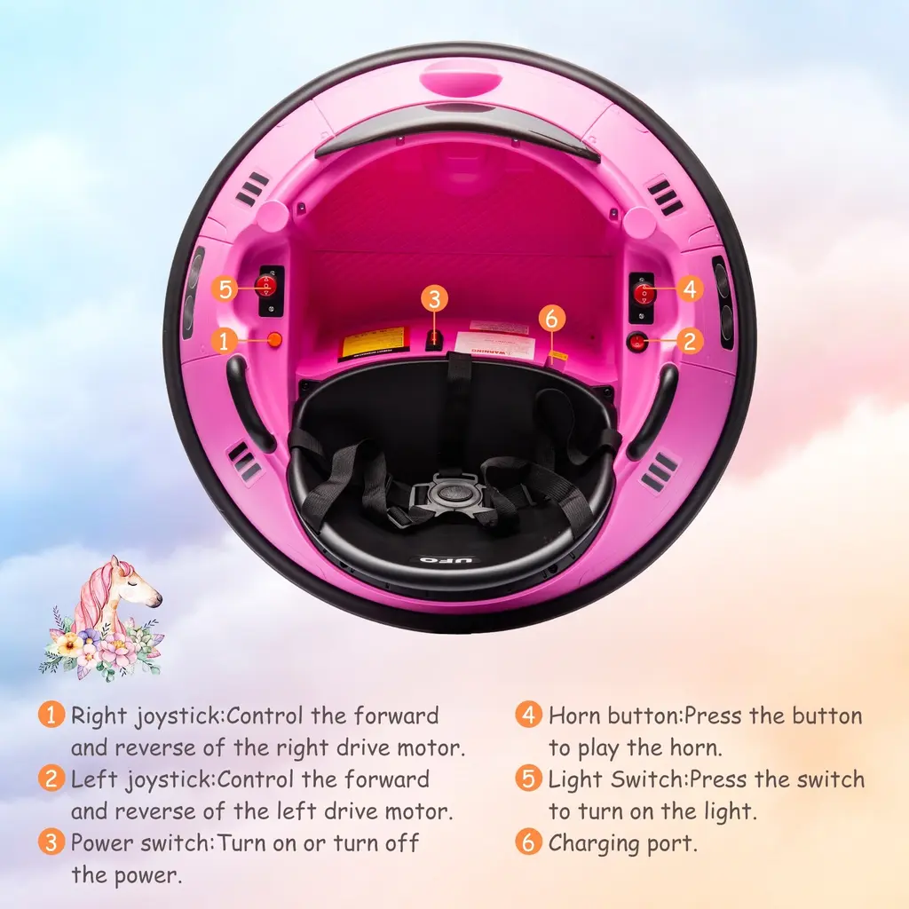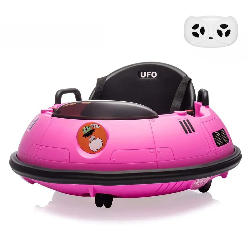 kids 12V bumper carThe unique UFO design makes it the perfect Christmas/New Year/birthday gift for children.It features moderate speed, adjustable seat belts, and soft bumpers, making it suitable for toddlers aged 1.5-3 years old for a comfortable and safe ride.Equipped with a horn, multi-colored flashing lights, and the ability to rotate 360 degrees, providing a fun driving experience for the little ones.Children can drive the bumper car using the steering wheel or be controlled by parents through remote control, you can enjoy the ride and parent-child entertainment to the fullest.Specifications:Color: Beige / Green / PinkRecommended Age: 1.5-5 YearsMaterial: PP and MetalBattery Type: 12V, 4.5AhMotor Type: 25W x 2Maximum User Weight: 44 LBSNet Weight: 20.06lbsCharging Time: 8-12 hrOverall Size: 25.7 inch(L) x 25.7 inch(W) x 14 inch(H)❗Note:Always keep the child in view when the child is in the vehicle.For the best performance, please ensure to charge the car for 8-12 hours before its first use. We also recommend not charging the car for more than 18 hours per charge to avoid any damage.