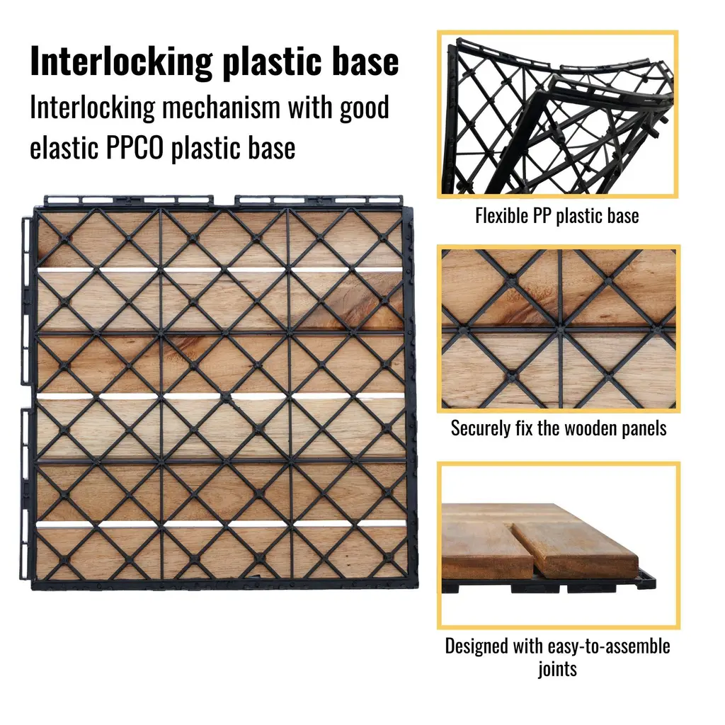 Upgrade your outdoor space with these stylish 12"x12" interlocking deck tiles made from durable yellow acacia hardwood. Featuring a sleek striped pattern, these tiles are perfect for patios, balconies, poolside areas, and gardens. Each tile is 0.75" thick (0.47" wood + 0.28" plastic base) with a waterproof, anti-mold finish for long-lasting use. The interlocking design ensures easy DIY installation, and tiles can be cut to fit corners. The plastic base promotes drainage, making them ideal for rainy seasons.Key Features:
