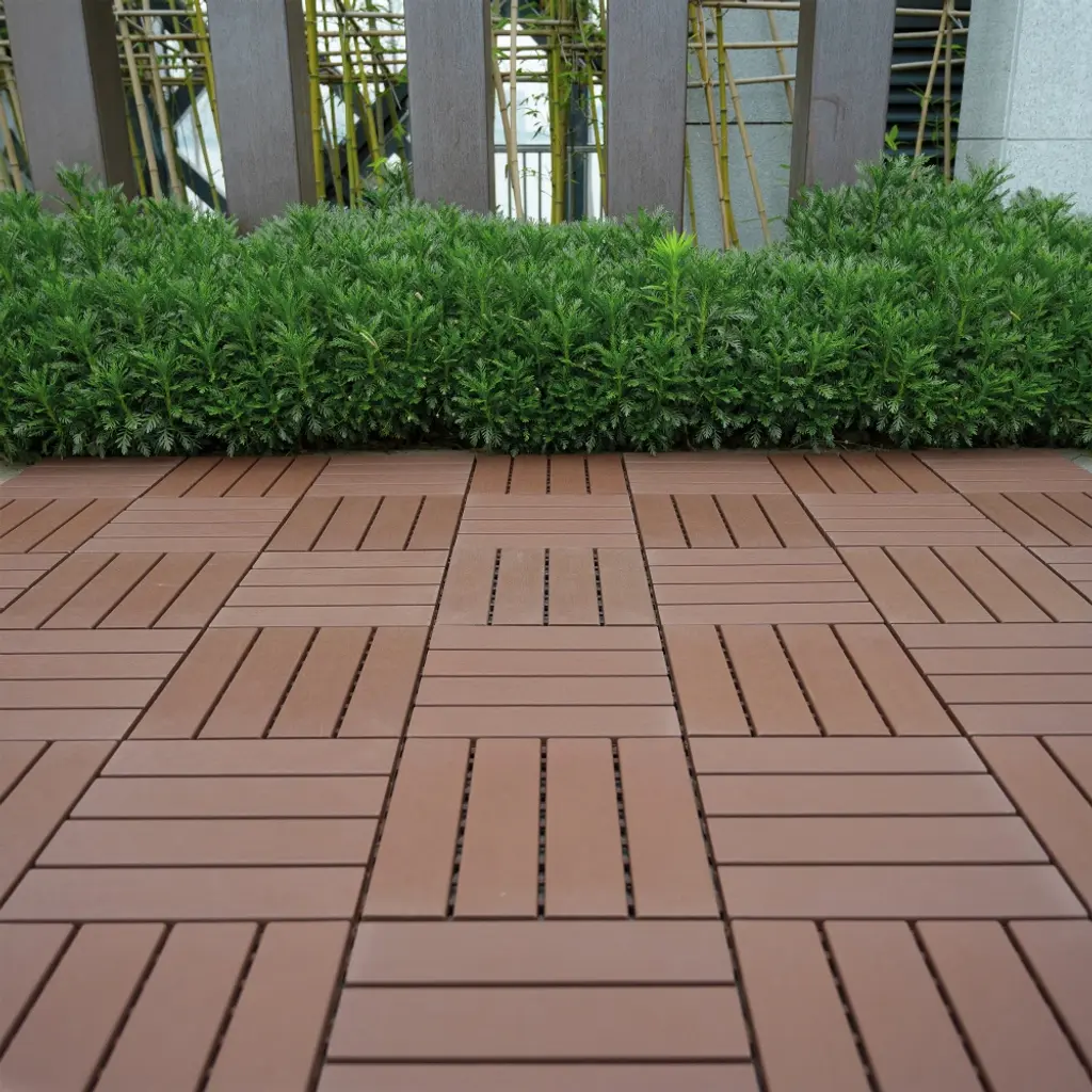 Upgrade your outdoor space with these stylish 12"x12" interlocking deck tiles made from durable yellow acacia hardwood. Featuring a sleek striped pattern, these tiles are perfect for patios, balconies, poolside areas, and gardens. Each tile is 0.75" thick (0.47" wood + 0.28" plastic base) with a waterproof, anti-mold finish for long-lasting use. The interlocking design ensures easy DIY installation, and tiles can be cut to fit corners. The plastic base promotes drainage, making them ideal for rainy seasons.Key Features: