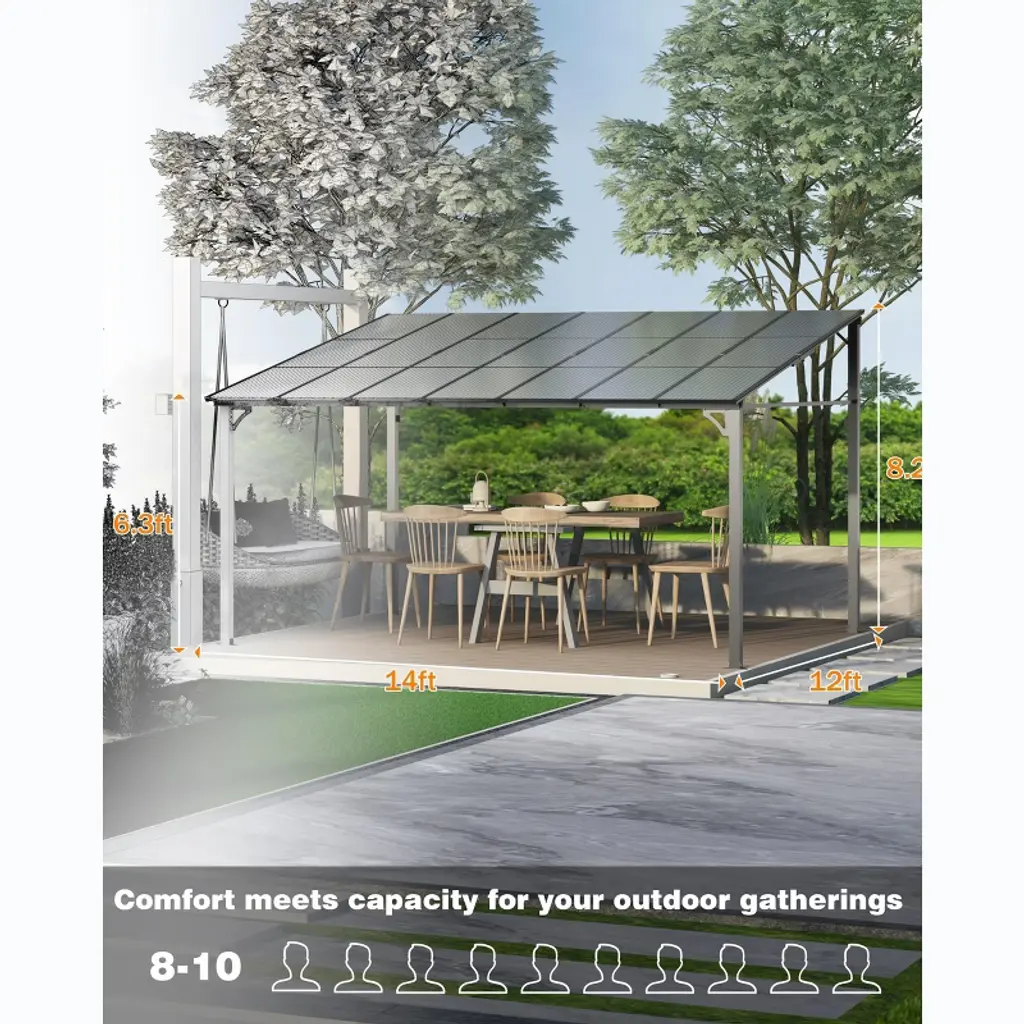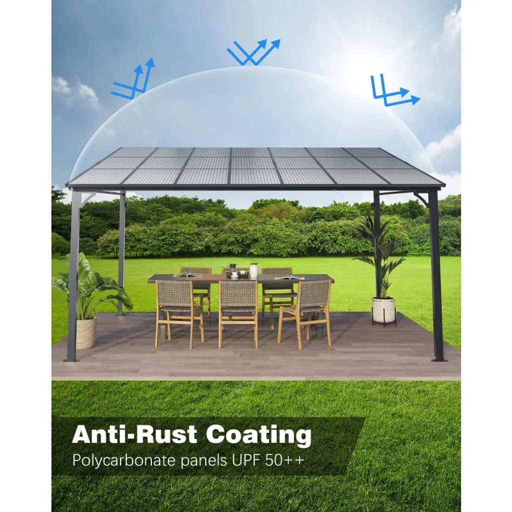 12x14 Ft Lean To Gazebo For Patio, Wall-mounted Hardtop Gazebo With Aluminum Frame And Sloped Polycarbonate Roof For Deck, Backyard