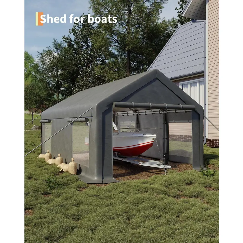 12x20 Ft Carport With 200g Pe Tarp, Roll-up Doors & 4 Windows, Fits Trucks, Tractors, Boats, And Suvs,gray