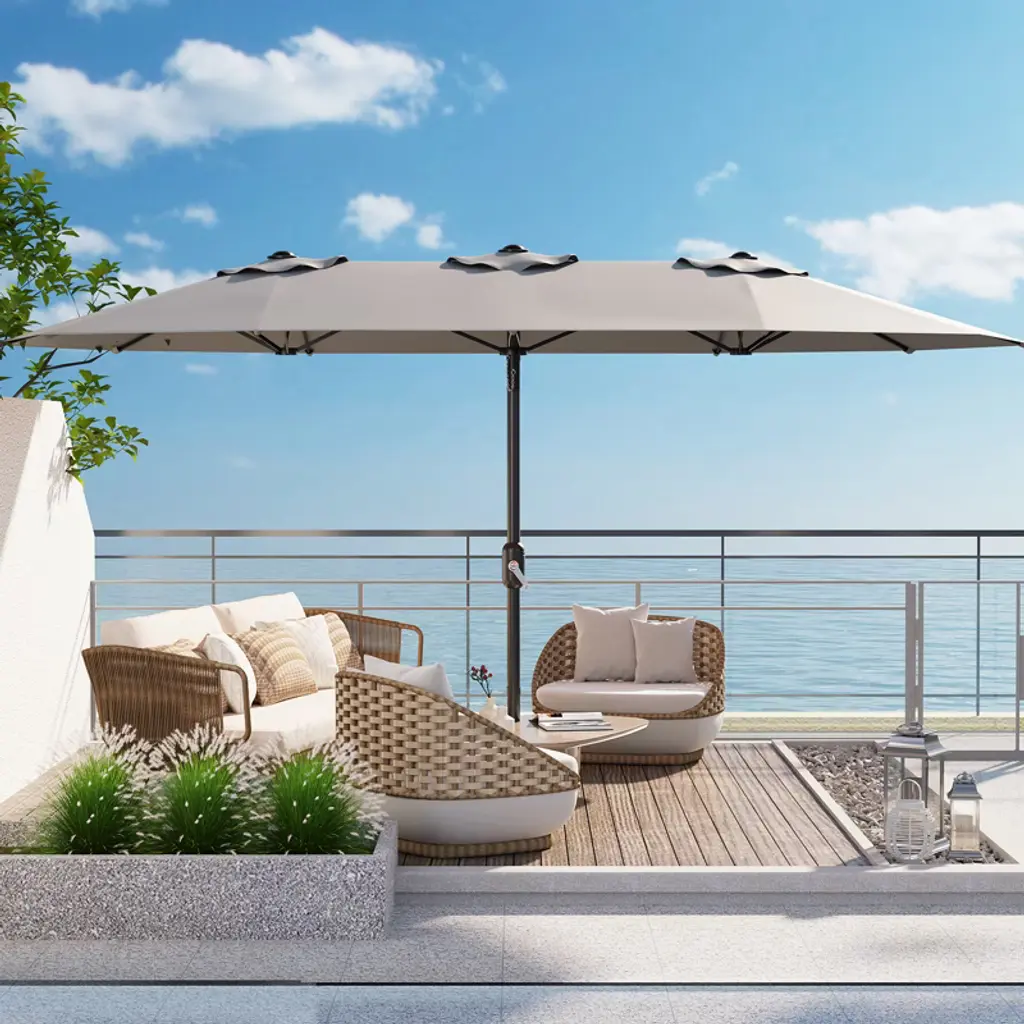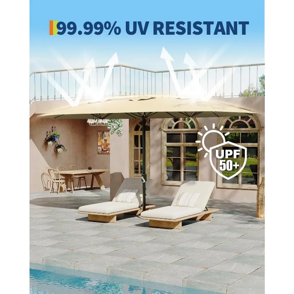13ft Premium Patio Umbrella - Ultimate UV Protection & Wind-Resistant Design for Outdoor Living!Transform Your Outdoor Space with Premium Sun ProtectionCreate the perfect shaded retreat with our 13ft x 6.5ft patio umbrella, offering 100 sq.ft of luxurious coverage for poolsides, gardens, and outdoor dining. Designed for durability and style, this umbrella combines heavy-duty construction with advanced UV protection to keep you cool and comfortable all day long.Why This Umbrella Stands Out:✔ Extra-Large Shade Coverage – Spacious 100 sq.ft canopy comfortably shelters 6-8 people, ideal for family gatherings, pool parties, or commercial use. ✔ Superior UV Defense – UPF 50+ fabric blocks 99.9% of harmful UV rays with a 3-year fade-resistant guarantee. ✔ Built to Last – Features 12 rust-resistant steel ribs, a powder-coated aluminum frame, and dual-layer vented canopy for wind stability and long-term durability. ✔ Easy Adjustability – Smooth crank handle and push-button tilt allow effortless height and angle adjustments to follow the sun. ✔ All-Weather Ready – Water-resistant, quick-drying fabric withstands outdoor elements, while the included sandbags and cross-frame base enhance stability.Perfect for Any Outdoor SettingWhether you're hosting a backyard BBQ, relaxing by the pool, or running a beachside café, this umbrella delivers reliable shade and style. Its compact folding design makes storage a breeze, while the sturdy construction ensures seasons of use.Upgrade Your Outdoor Comfort Today – Stay Cool, Stylish & Protected!