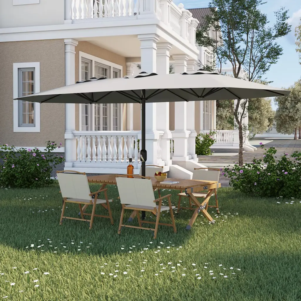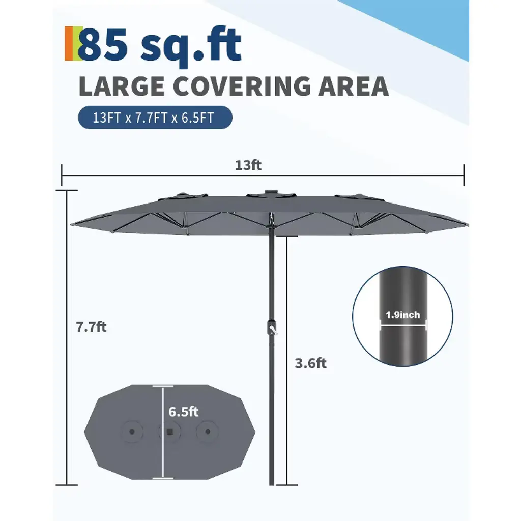 13ft Premium Patio Umbrella - Ultimate UV Protection & Wind-Resistant Design for Outdoor Living!Transform Your Outdoor Space with Premium Sun ProtectionCreate the perfect shaded retreat with our 13ft x 6.5ft patio umbrella, offering 100 sq.ft of luxurious coverage for poolsides, gardens, and outdoor dining. Designed for durability and style, this umbrella combines heavy-duty construction with advanced UV protection to keep you cool and comfortable all day long.Why This Umbrella Stands Out:✔ Extra-Large Shade Coverage – Spacious 100 sq.ft canopy comfortably shelters 6-8 people, ideal for family gatherings, pool parties, or commercial use. ✔ Superior UV Defense – UPF 50+ fabric blocks 99.9% of harmful UV rays with a 3-year fade-resistant guarantee. ✔ Built to Last – Features 12 rust-resistant steel ribs, a powder-coated aluminum frame, and dual-layer vented canopy for wind stability and long-term durability. ✔ Easy Adjustability – Smooth crank handle and push-button tilt allow effortless height and angle adjustments to follow the sun. ✔ All-Weather Ready – Water-resistant, quick-drying fabric withstands outdoor elements, while the included sandbags and cross-frame base enhance stability.Perfect for Any Outdoor SettingWhether you're hosting a backyard BBQ, relaxing by the pool, or running a beachside café, this umbrella delivers reliable shade and style. Its compact folding design makes storage a breeze, while the sturdy construction ensures seasons of use.Upgrade Your Outdoor Comfort Today – Stay Cool, Stylish & Protected!