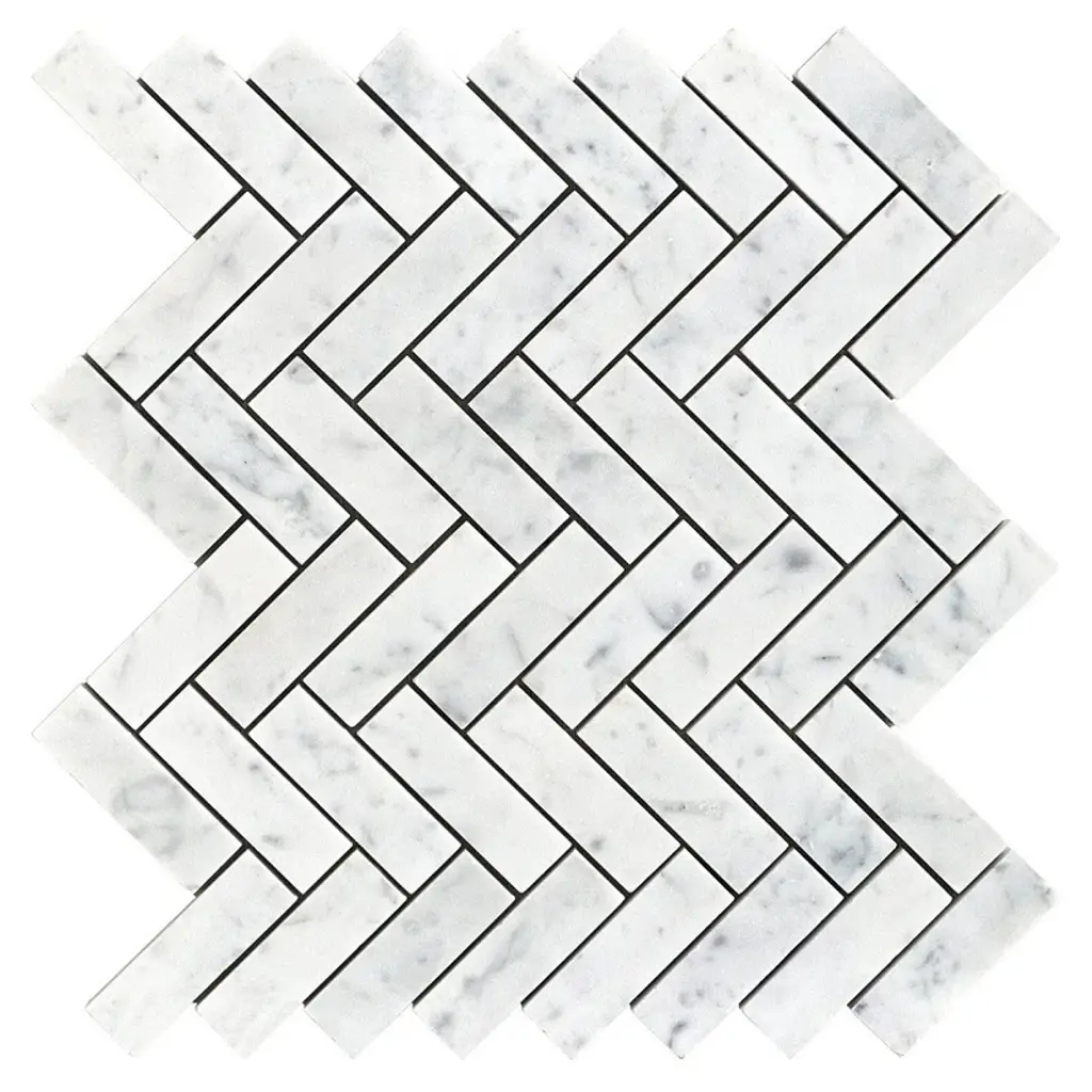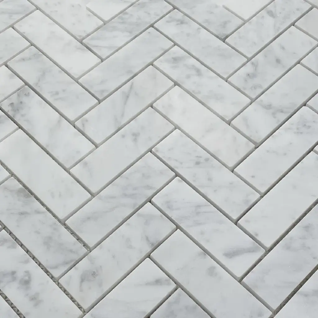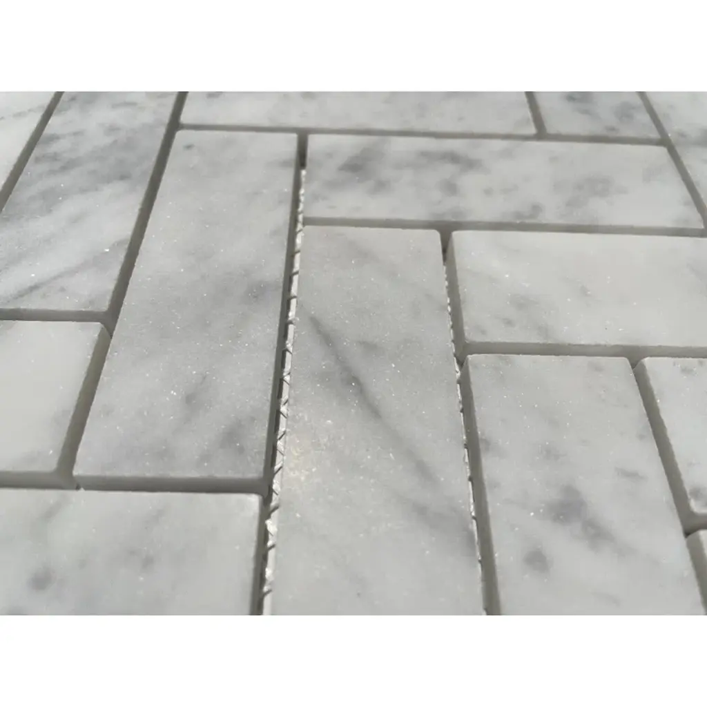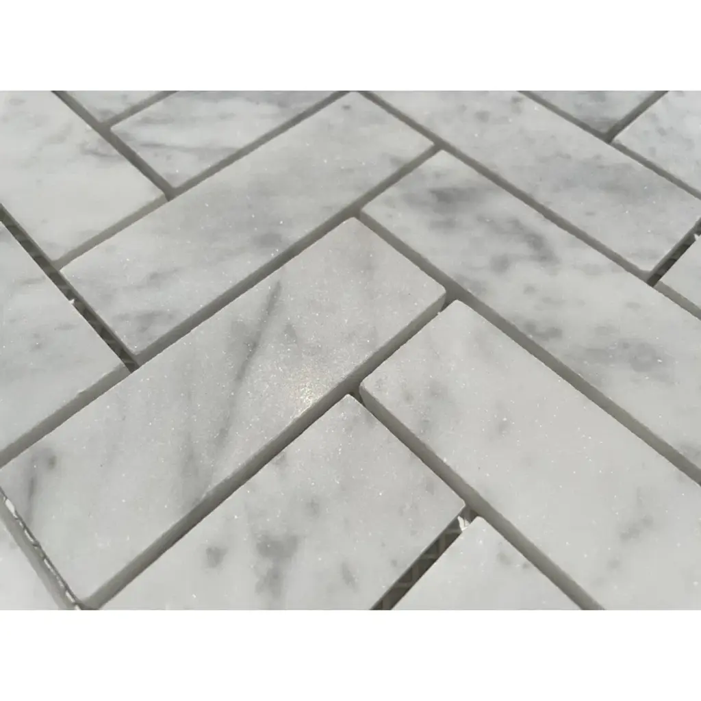 Premium grade 1x3 herringbone white carrara marble mosaic tile. Italian bianco carrera white venato carrara honed 1 x 3 herringbone mosaic wall and floor tiles are perfect for any residential / commercial projects. The 1x3 carrara white marble herringbone mosaic tile can be used for kitchen backsplash, bathroom flooring, shower surround, dining room, entryway, corridor, kitchen backsplash, spa, etc. Our timeless matte white carrera marble big herringbone mosaic tile with a large selection of coordinating products is available and includes hexagon, brick, basketweave mosaics