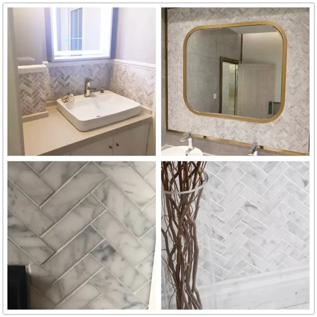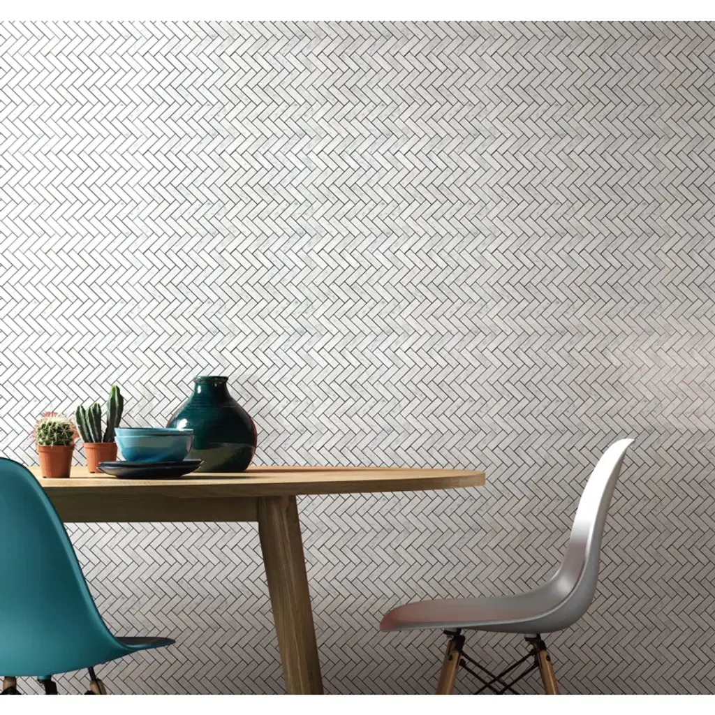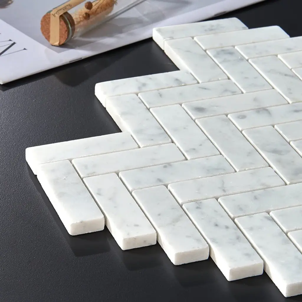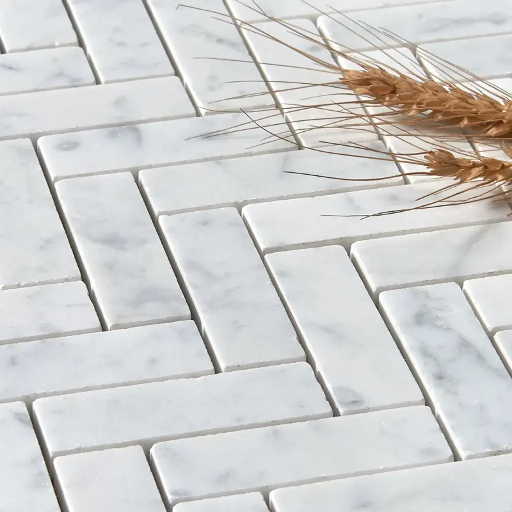 Premium grade 1x3 herringbone white carrara marble mosaic tile. Italian bianco carrera white venato carrara honed 1 x 3 herringbone mosaic wall and floor tiles are perfect for any residential / commercial projects. The 1x3 carrara white marble herringbone mosaic tile can be used for kitchen backsplash, bathroom flooring, shower surround, dining room, entryway, corridor, kitchen backsplash, spa, etc. Our timeless matte white carrera marble big herringbone mosaic tile with a large selection of coordinating products is available and includes hexagon, brick, basketweave mosaics