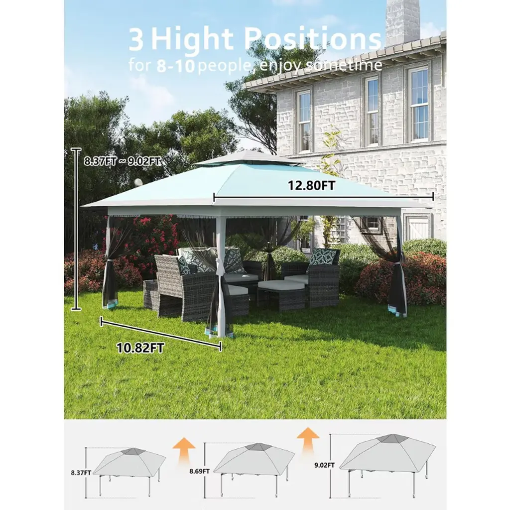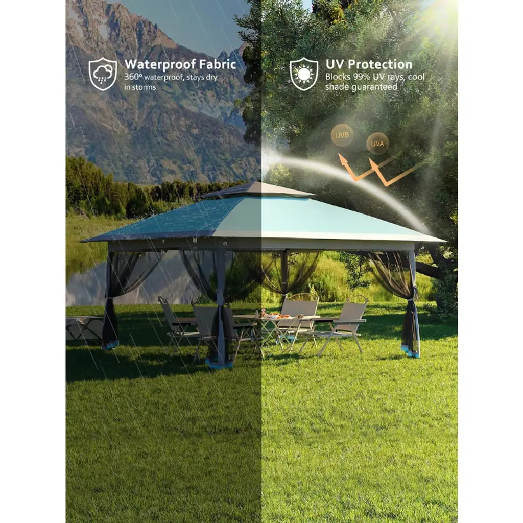 Product DescriptionTransform outdoor spaces instantly with this 13x13 ft pop-up gazebo featuring integrated mosquito netting. Engineered for durability and effortless setup, it delivers reliable sun protection, insect defense, and weather resistance for patios, gardens, and events. Technical Specifications Frame: Galvanized steel (0.8mm thickness) Canopy: 240D polyester with PU coating Dimensions: 13 ft x 13 ft (169 sq ft) Peak Height: 7.2 ft (86 inches) Netting: Removable 300-denier mesh panels Weight: 55 lbs (including carry bag) Packed Size: 52" x 13" x 13" wheeled storage bag Ideal for poolside gatherings, backyard weddings, or outdoor markets. This gazebo maintains cool shade during summer heat while offering adaptable insect protection and quick teardown for portable use across seasons.