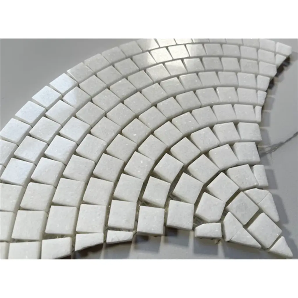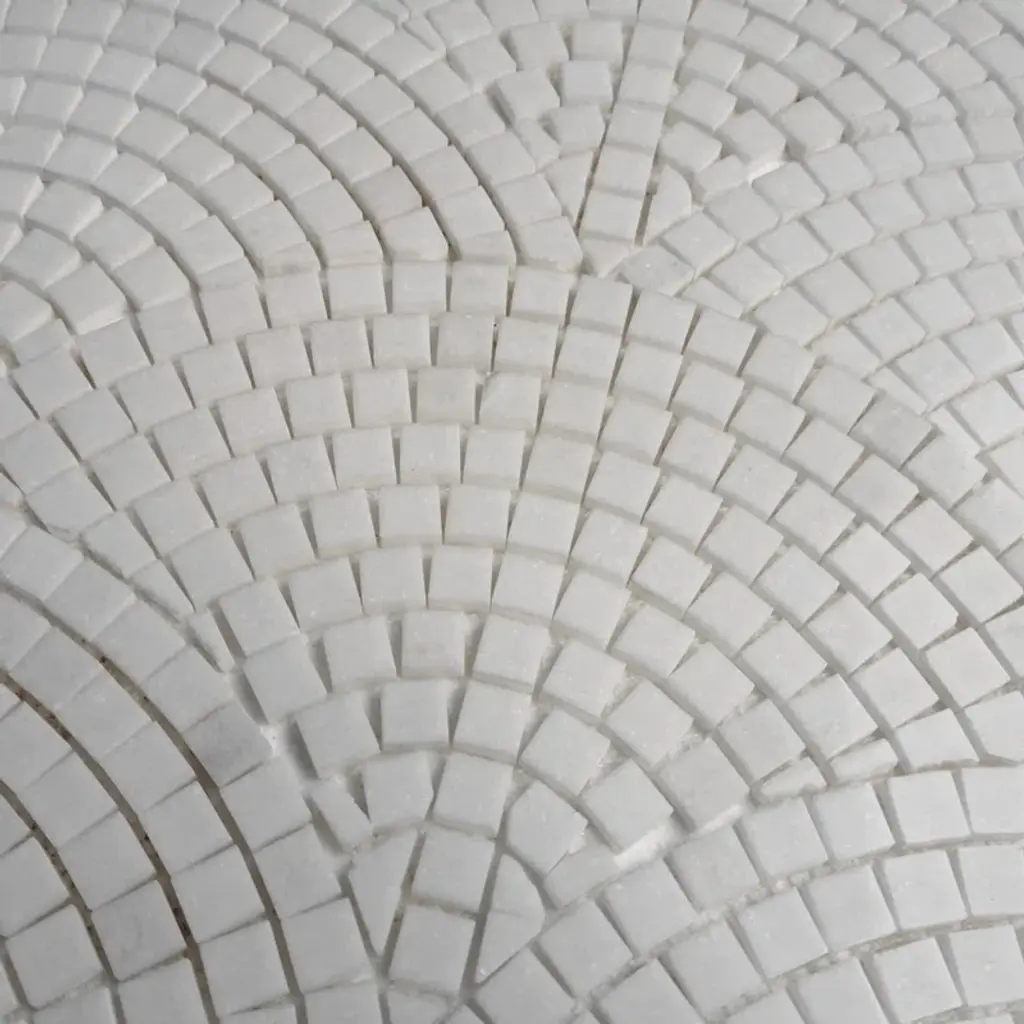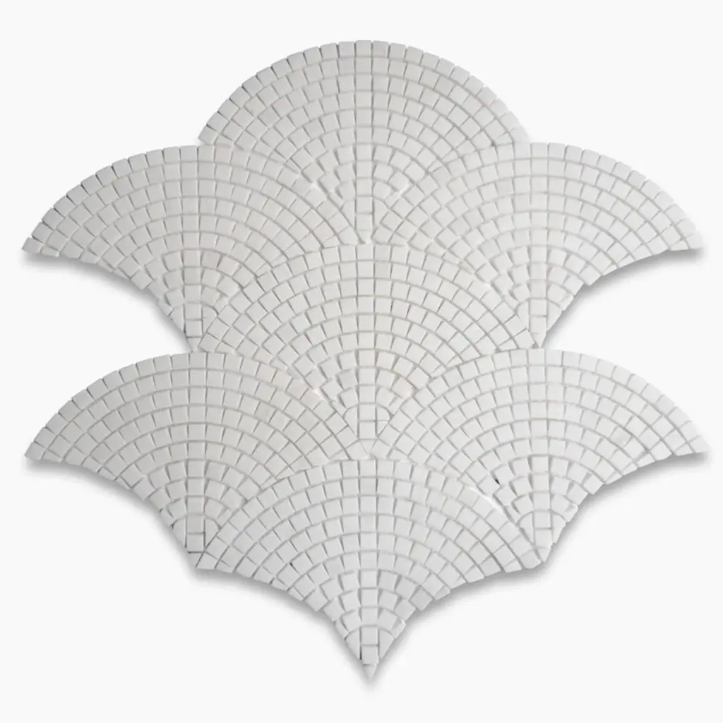 Premium Grade White Thassos Marble Mosaic Tiles. Greek Thassos White Pure White Crystal Marble Polished Mini Fish Scale Scallop Fan Pattern Mosaic Wall & Floor Tiles are perfect for any interior projects. The Mini Thassos White Marble Fish Scale Pattern Mosaic tiles can be used for a kitchen backsplash, bathroom flooring, shower surround, dining room, entryway, spa. Our timeless Glossy White Thassos Marble Scallop Fan Pattern Mosaic tiles with a large selection of coordinating products is available and include arabesque, fish scale, penny round, herringbone, basketweave mosaics, 12x12, 18x18, 12x39, subway tiles, moldings, borders, and more.