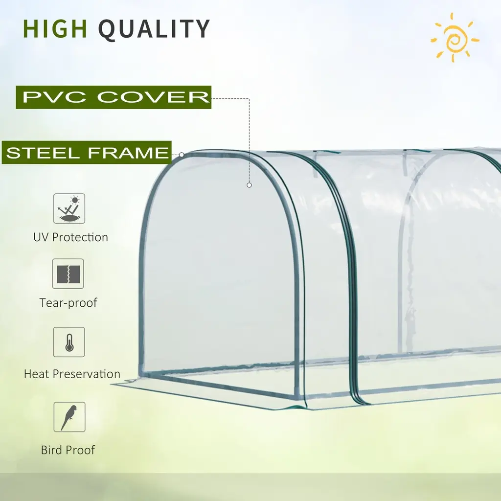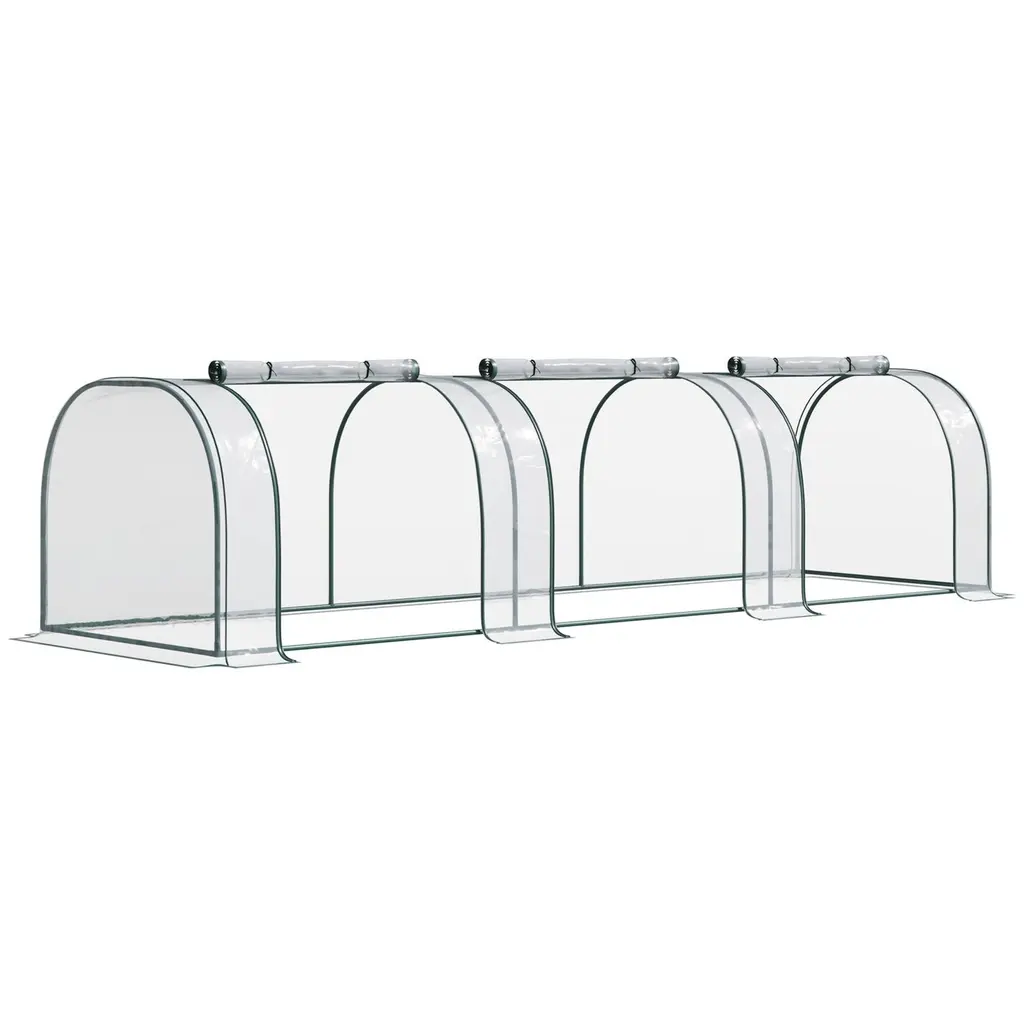 The Outsunny 11' x 3' x 2.5' Mini Greenhouse is a compact and portable gardening solution designed for gardeners who want to create a controlled environment for their plants outdoors. This mini greenhouse features a roll-up zippered door, providing easy access and a secure closure to protect your plants from pests and harsh weather conditions. Its dimensions of 11 feet in length, 3 feet in width, and 2.5 feet in height make it a small yet spacious structure, suitable for a range of gardening needs.The greenhouse is covered with a UV waterproof cover, which ensures protection against the elements while allowing sunlight to reach your plants. The steel frame provides stability and durability, making it a reliable structure for your gardening projects.Overall, the Outsunny Mini Greenhouse is an excellent choice for those looking to create a controlled environment for their plants outdoors, offering convenience, durability, and ample space for a variety of gardening needs.