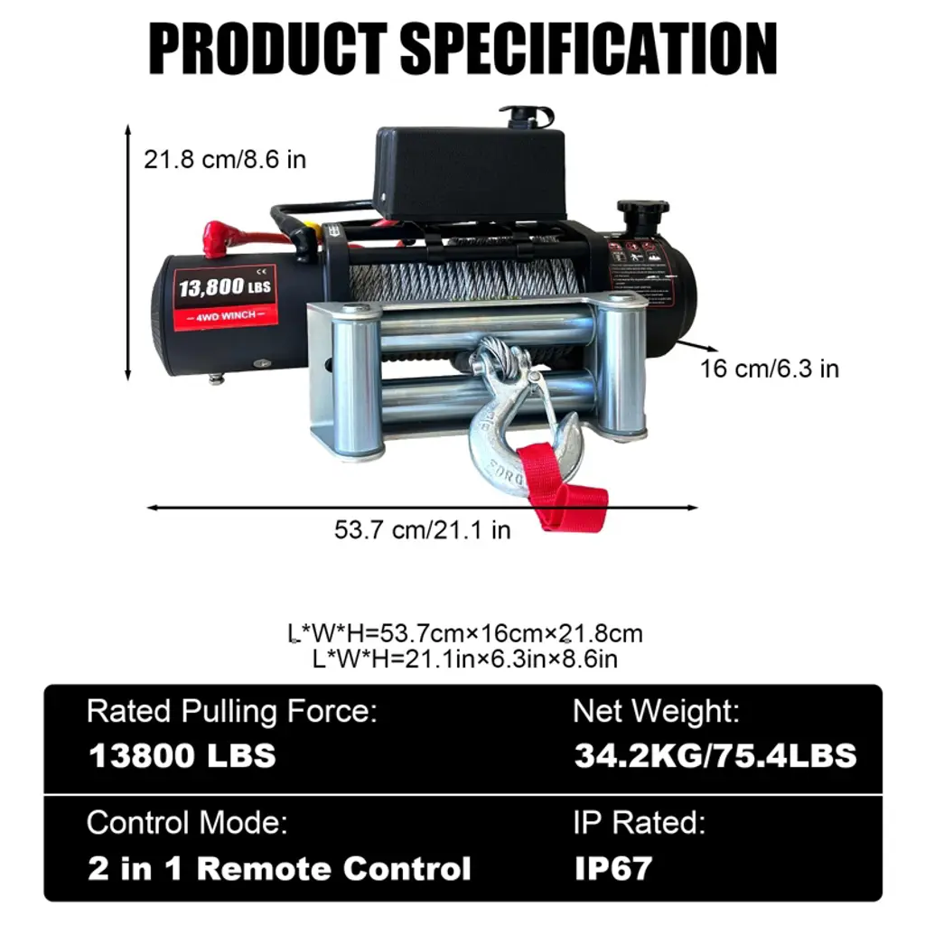 13800lbs Electric Vehicle Winch, Waterproof Ip67 80ft Steel Cable Truck Winch With Wireless Handheld Remote, 12v Power Winch For Towing Utv Off Road