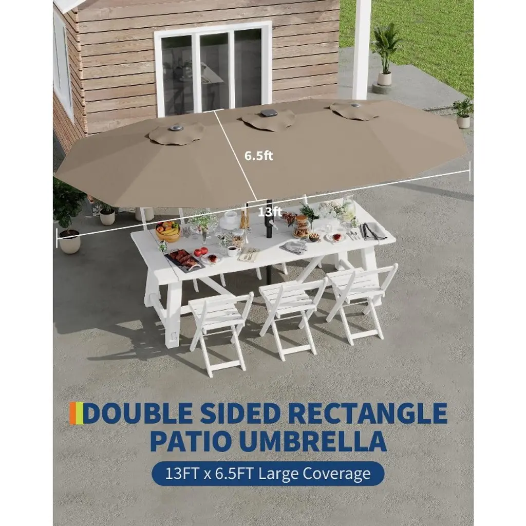 Product Description: This 13ft double-sided patio umbrella delivers 360° shade for 6+ seats with UPF 50+ canopy (blocks 99.99% UV rays). Features a 1.9" alloy steel pole and 12 rust-proof ribs for wind resistance. Easy crank lift opens/closes in seconds. 180gsm polyester fabric resists fading, water, and tears. Fits standard umbrella bases. Key Features: ✔ XL Coverage – 13ft shade for tables/decks/pools ✔ UPF 50+ – Blocks 99.99% UV rays ✔ All-Weather – Rust-proof frame + fade-resistant canopy✔ Easy Crank – Smooth one-hand operation ✔ Low Maintenance – Wipes clean with damp cloth Specs: Material: Steel pole + polyester canopy Size: 13ft diameter × 7.8ft height Setup: Tools included (10-min assembly) Includes: Umbrella + ribs (base sold separately)