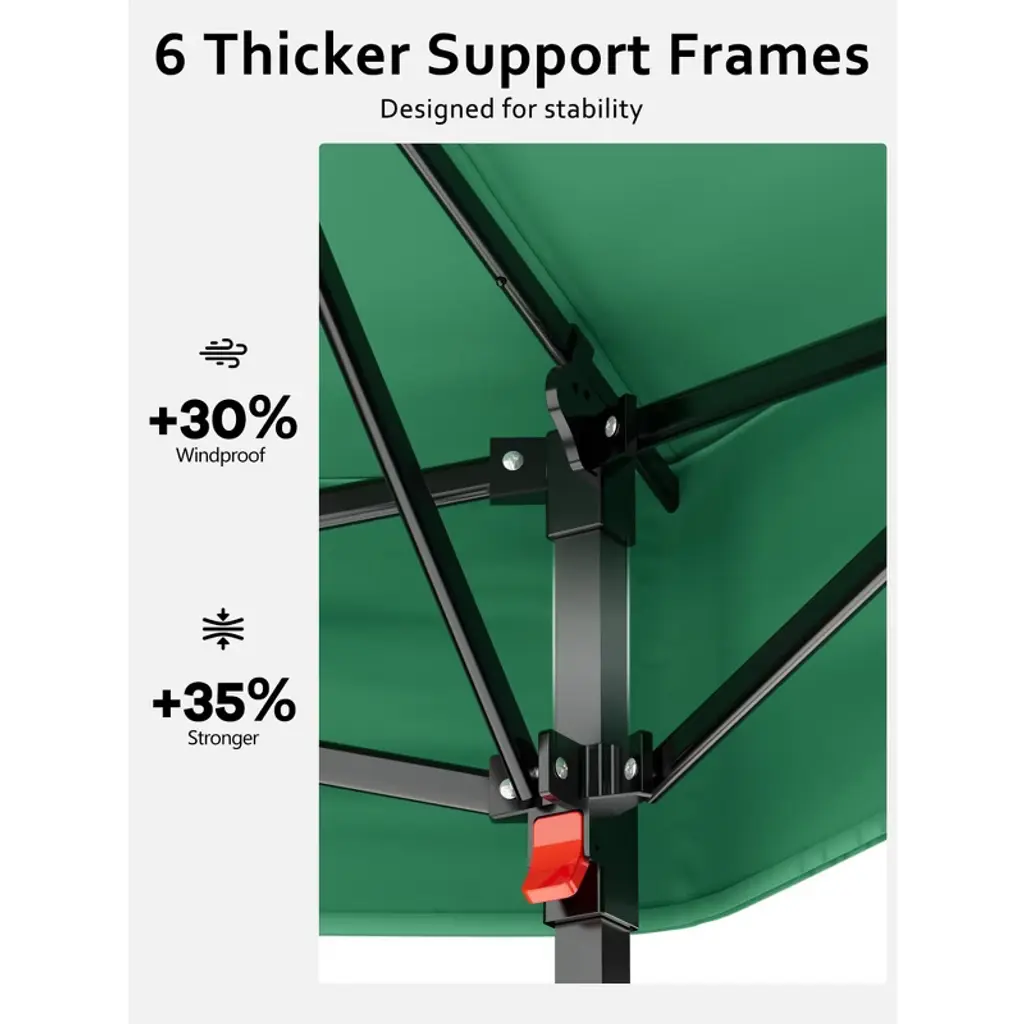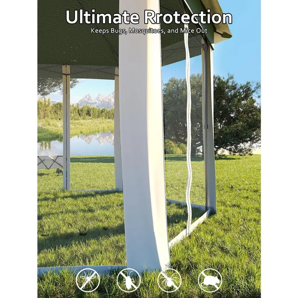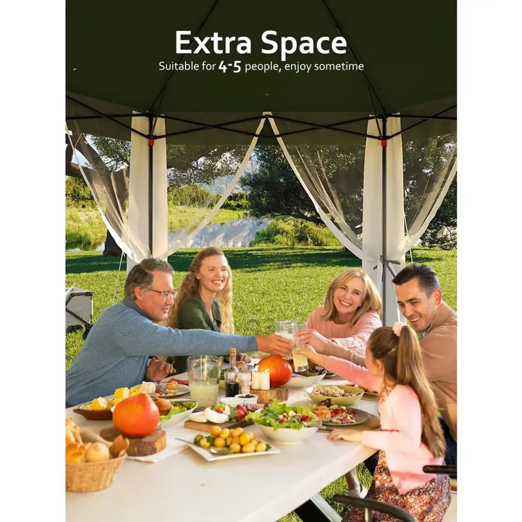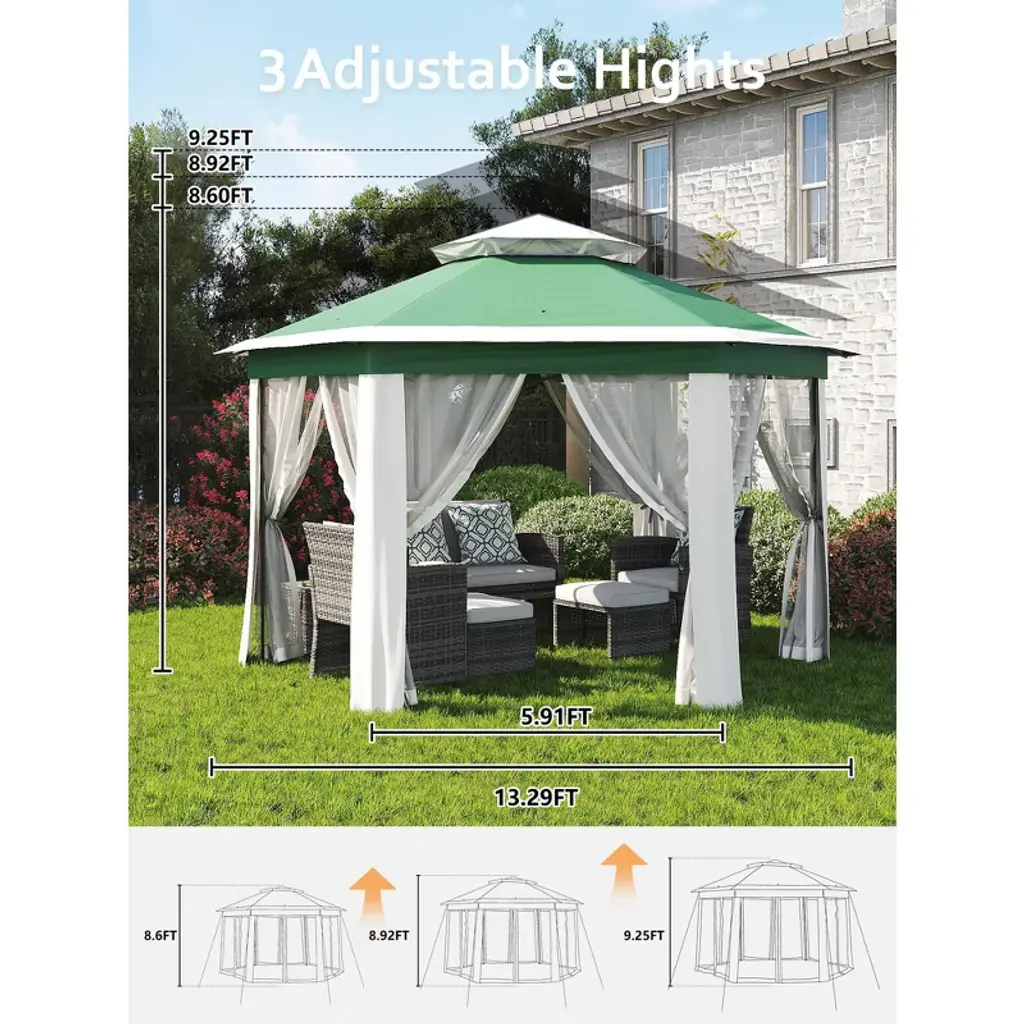 DOUBLE-LAYER VENTILATED CANOPY: The double-roof design, with a waterproof and UV-resistant canopy top, provides all-around protection. It keeps you dry during light rain while drainage holes prevent water accumulation on top, reducing weight load. On sunny days, the ventilated double roof reduces heat and increases airflow, offering you all-weather protection.STURDY STEEL FRAME: The steel frame of this pop up canopy tent is powder-coated for corrosion resistance, making it easy to set up and fold down. It can easily fit into the included carry bag for convenient transport to wherever you want to go, serving as your outdoor shelter.GAZEBOS WITH NETTING: This outdoor canopy tent has fully enclosed mesh screens that shield against pesky elements while enhancing your personal privacy experience. Each mesh panel of this pop-up tent features a dual-head zipper for added convenience.ADJUSTABLE HEIGHT: This pop-up patio gazebo provides ample space, sets up quickly, and is easy to take with you. It features three adjustable height levels to meet your needs for any occasion.DIMENSIONS: Overall size: 13.3'L x 13.3'W x 9.3'H; eave height: 6.6'; hexagonal side length: 6.6'. Don't leave your shelter unattended; take it down before a strong storm arrives. Be sure to use the included stakes and the guy lines provided during use.