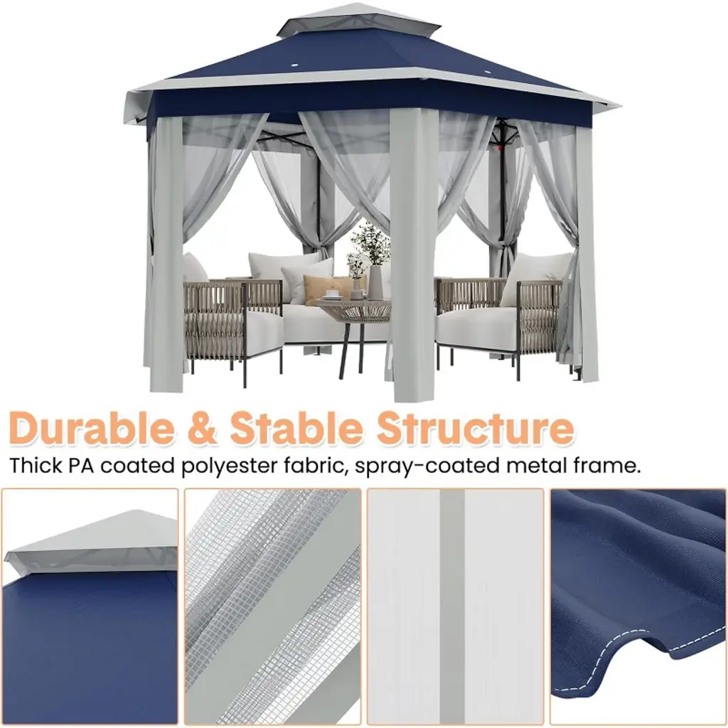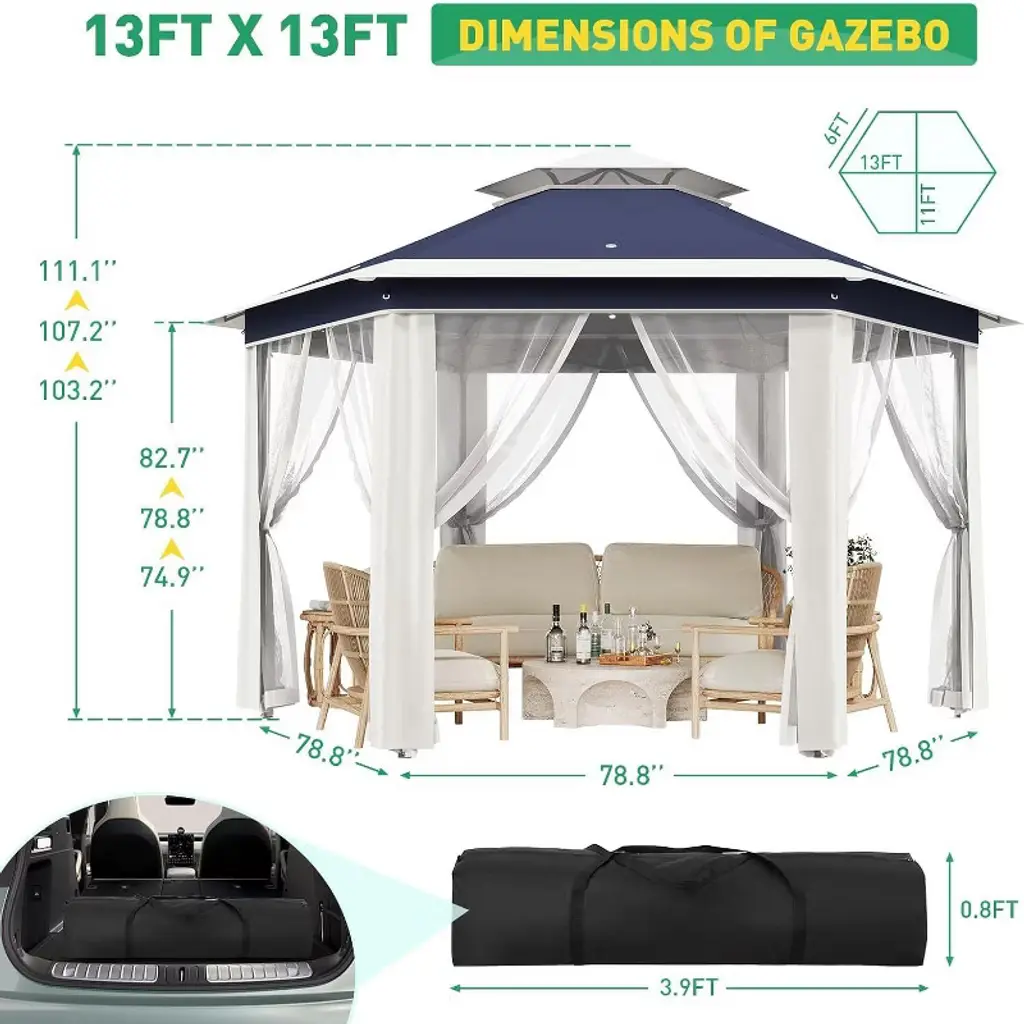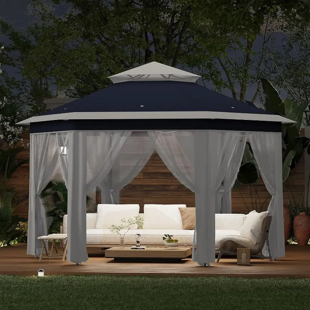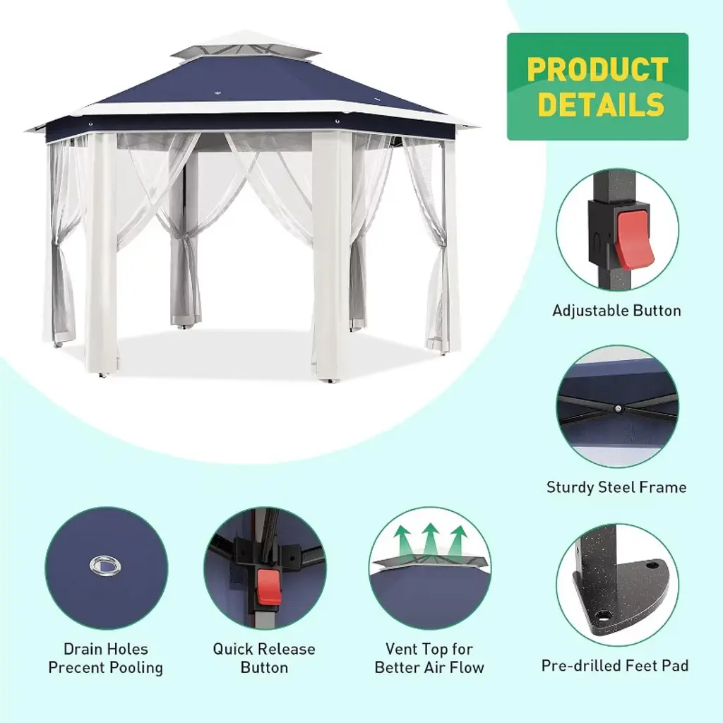13x13ft Hexagonal Patio Pop-up Gazebo, Canopy Shelter With Mesh Netting, Event Tent With Strong Steel Frame For Backyard, Garden, Lawn, Blue+beige