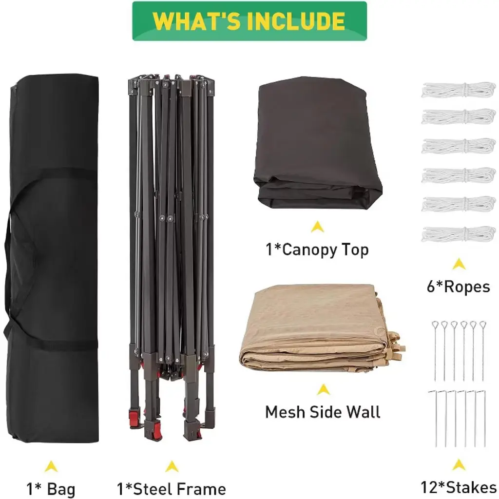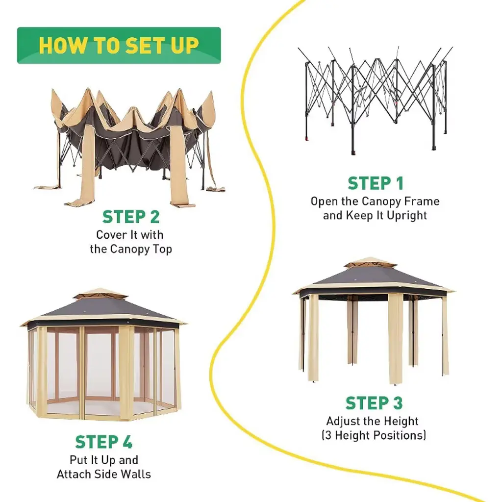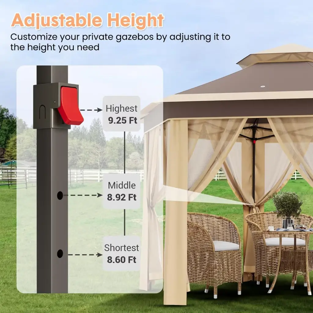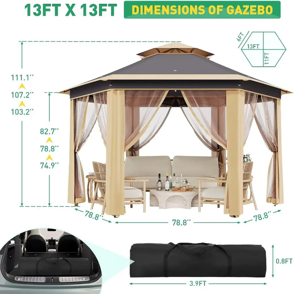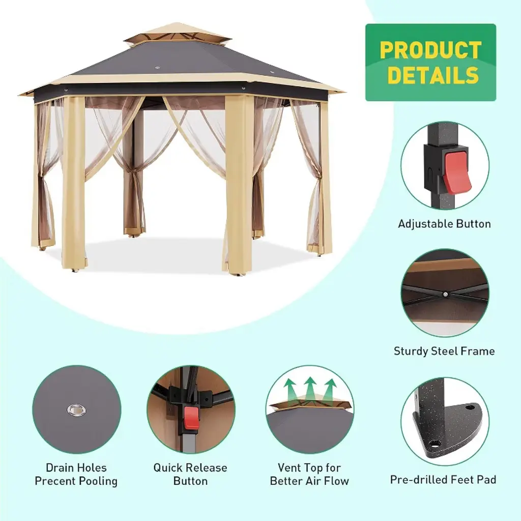 All-Weather Durability & Protection: Constructed with a heavy-duty galvanized iron frame and a waterproof, UV-resistant polyester canopy, this gazebo offers reliable protection against sun and light rain. The frame supports up to 250 lbs and resists winds up to level 7, ensuring stability and safety in various weather conditions. Spacious Hexagonal Shape: Providing 169 square feet of shaded area, the hexagonal design comfortably accommodates group gatherings, outdoor markets, or patio furniture. The adjustable height ranging from 6.2 to 9.2 feet allows customization to suit different needs and preferences.