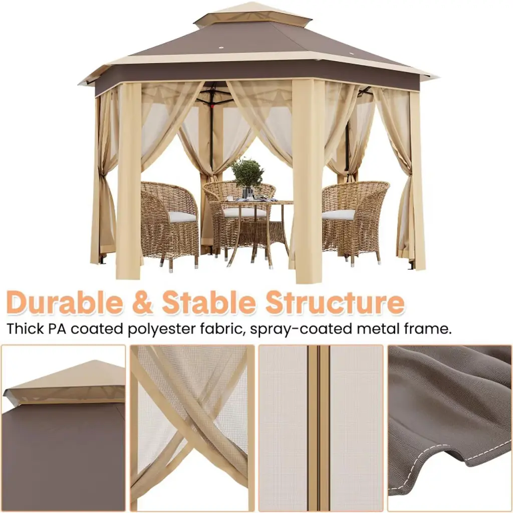 13x13ft Hexagonal Patio Pop-up Gazebo, Canopy Shelter With Mesh Netting, Event Tent With Strong Steel Frame For Backyard, Garden, Lawn, Khaki+beige