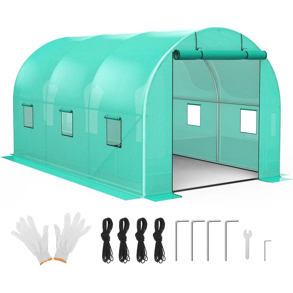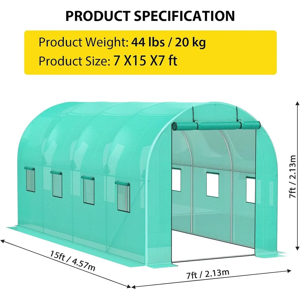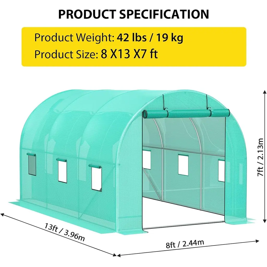 Spacious Walk-In Design: Measuring 13 x 8 x 7 ft, this walk-in greenhouse offers ample space for growing a diverse range of plants. The spacious interior allows for easy access and maintenance of your plants, and provides room for multiple plant shelves, catering to both home gardeners and commercial growers. Upgraded Heavy-Duty Galvanized Frame: Constructed with reinforced 0.8" diameter galvanized pipes (0.02" wall thickness), this tunnel greenhouse boasts exceptional strength and stability. Enhanced stability features include reinforced rust-proof poles, added diagonal bars, L-shaped stakes, and tie-down ropes, ensuring your plants remain protected from harsh weather conditions. Thick High-Density PE Cover: Equipped with a premium 140g/m² PE plastic cover, this high tunnel greenhouse is waterproof, sun-resistant, and insulating, fostering optimal plant growth. The double-stitched seams and reinforced window seams provide extra durability against tearing. The extended edges can be weighted down with stones or buried in soil, enhancing insulation, airtightness, and humidity control for a stable growing environment. Adequate Ventilation Design: This hoop house greenhouse features 6 strategically placed mesh windows and a large roll-up zipper door to promote excellent airflow. The innovative mesh net design prevents small pests from entering while ensuring proper ventilation, creating a healthy environment for your plants to thrive. Versatile Use for Multiple Settings: Perfect for home gardens, farms, and small commercial operations, this tunnel greenhouse is designed to create an ideal growing environment for various plants. It effectively extends your planting season, enabling you to enjoy gardening year-round, regardless of weather conditions.
