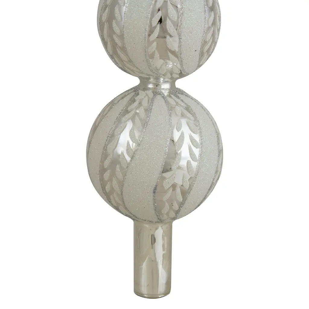 Give your holiday decor a touch of elegance and vintage flair with this beautiful glass tree topper. Finial features a beautiful white glitter design that will reflect your Christmas lights and dazzle your room! A beautiful topper ready to complement your home and Christmas tree with ease! Product Features: Glass tree topper Finish: shiny White glitter design Finial shape with a long pointed top Round hole at the bottom to place on the top of your tree Dimensions: 14.75" high x 2.5" diameter Material(s): glass