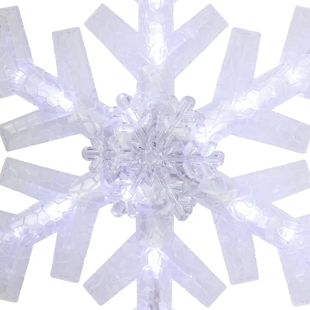Light up your holiday season with this beautiful lighted LED snowflake Christmas tree topper. With its pure white LED lights and intricate snowflake design, this topper is a festive addition to any Christmas tree. Let this snowflake tree topper be the perfect finishing touch to your holiday decor! Product Features: Color: pure white bulbs / white wire Number of bulbs: 15 Bulb size: concave wide angle Bulb type: LED 40" lead cord Double-sided design Product Features: Super bright bulbs UL certified and approved for indoor use only If one bulb burns out, the rest will stay lit Comes with replacement bulbs and spare fuses Attached clip makes fastening to tree effortless Contains 1 plug with end connector which allows you to stack multiple lighted items together (not to exceed 210 watts) Dimensions: 14.75"H x 7.5"W x 1.5"D Material(s): plastic/glass bulbs/wire
