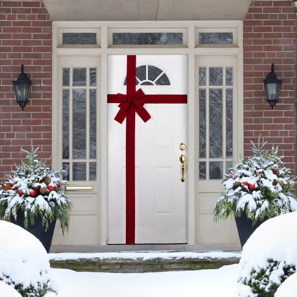 Add a touch of festive elegance to your home with the classic Christmas door bow. Made from luxurious red velvet, this bow is the perfect addition to your holiday decor. The bow comes equipped with velcro fasteners for easy installation and removal, making it a convenient and hassle-free addition to your holiday decorations. Whether you're hosting a festive gathering or simply looking to spruce up your home for the season, this door bow is sure to impress your guests. Product Features: Red Christmas door bow Features classic red velvet Comes with velcro fasteners Recommended for indoor use Dimensions: 167"H x 77.75"W x .50"D Bow: 11.5" high by 12" wide Material(s): fabric/velcro