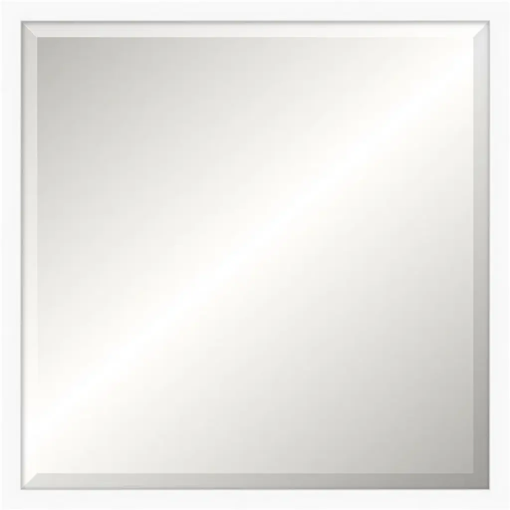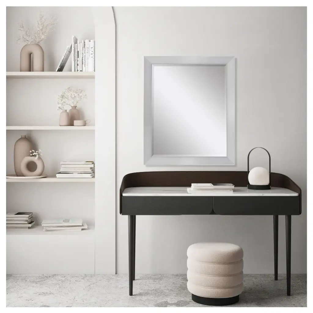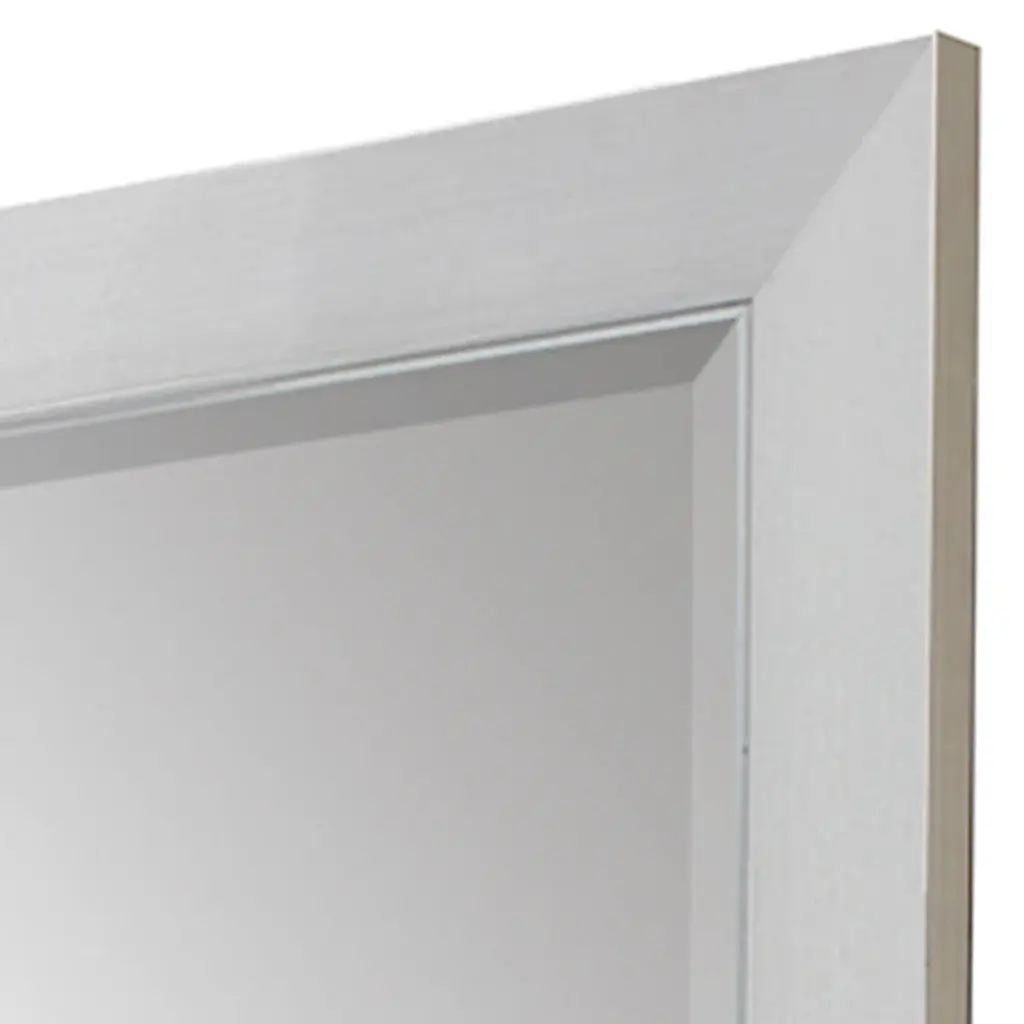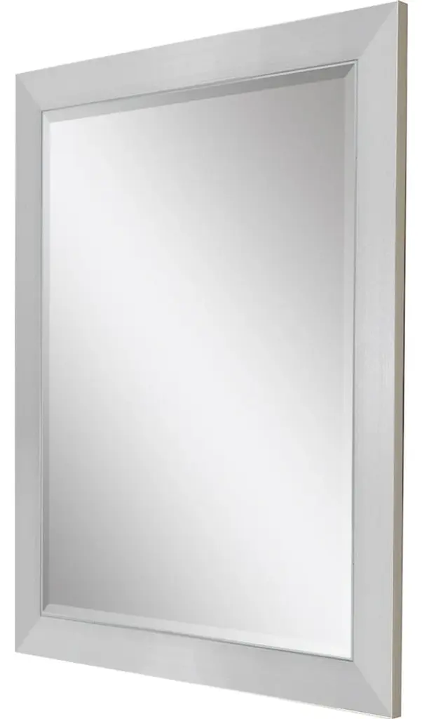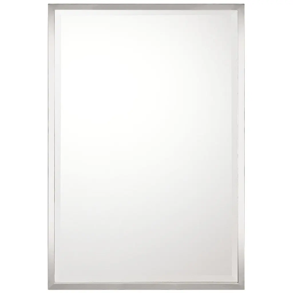 Elegant beveled mirror is framed in a contemporary style moulding in a chrome-silver finish.