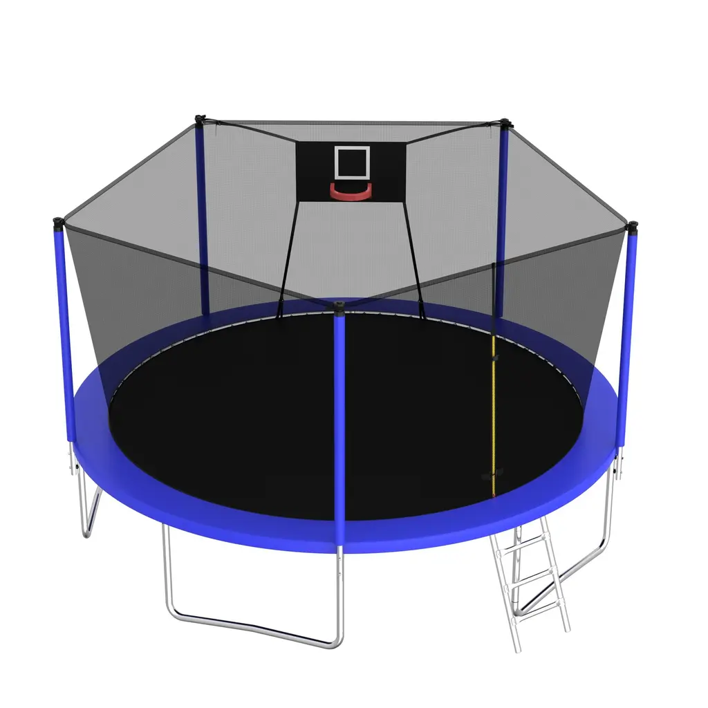 Description14FT Trampoline Blue for kids Outdoor with safety net and Soft rebound and Ladder.14FT Trampoline have 5 high safety enclosure poles and heavy gauge galvanized rust resistance steel construction. 5 W-shaped legs secure stability. We have comprehensive testing of the chemical composition of the material and the structure design of the product to ensure its safety. Our safety net: PE material, sunscreen and wear resistance Passed the standard 500-hour UV test. Effectively improve the safety of trampoline performance. Galvanized spring and jumping mat: The 14 ft trampoline is equipped with 80PCS springs with strong stretch and rebound that can improve enough bounce. And our jumper has passed 5000 hours of UV test, waterproof and sunscreen. Have plenty of space to jump.DATAILS14FT Trampoline have 5 high safety enclosure poles and heavy gauge galvanized rust resistance steel construction.SPRINGSGalvanized white zinc, a 9-word hook, a ordinary hook.Specification: 80pcsDETAILS14FT Trampoline Blue for kids Outdoor with safety net and Soft rebound and Ladder.