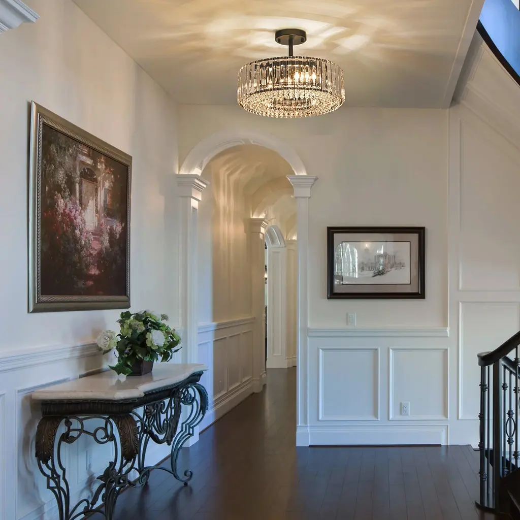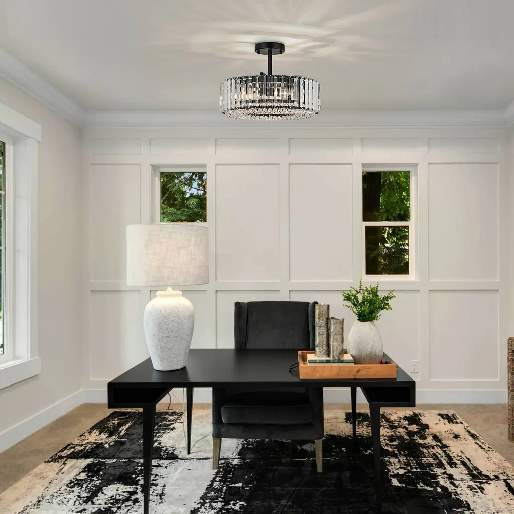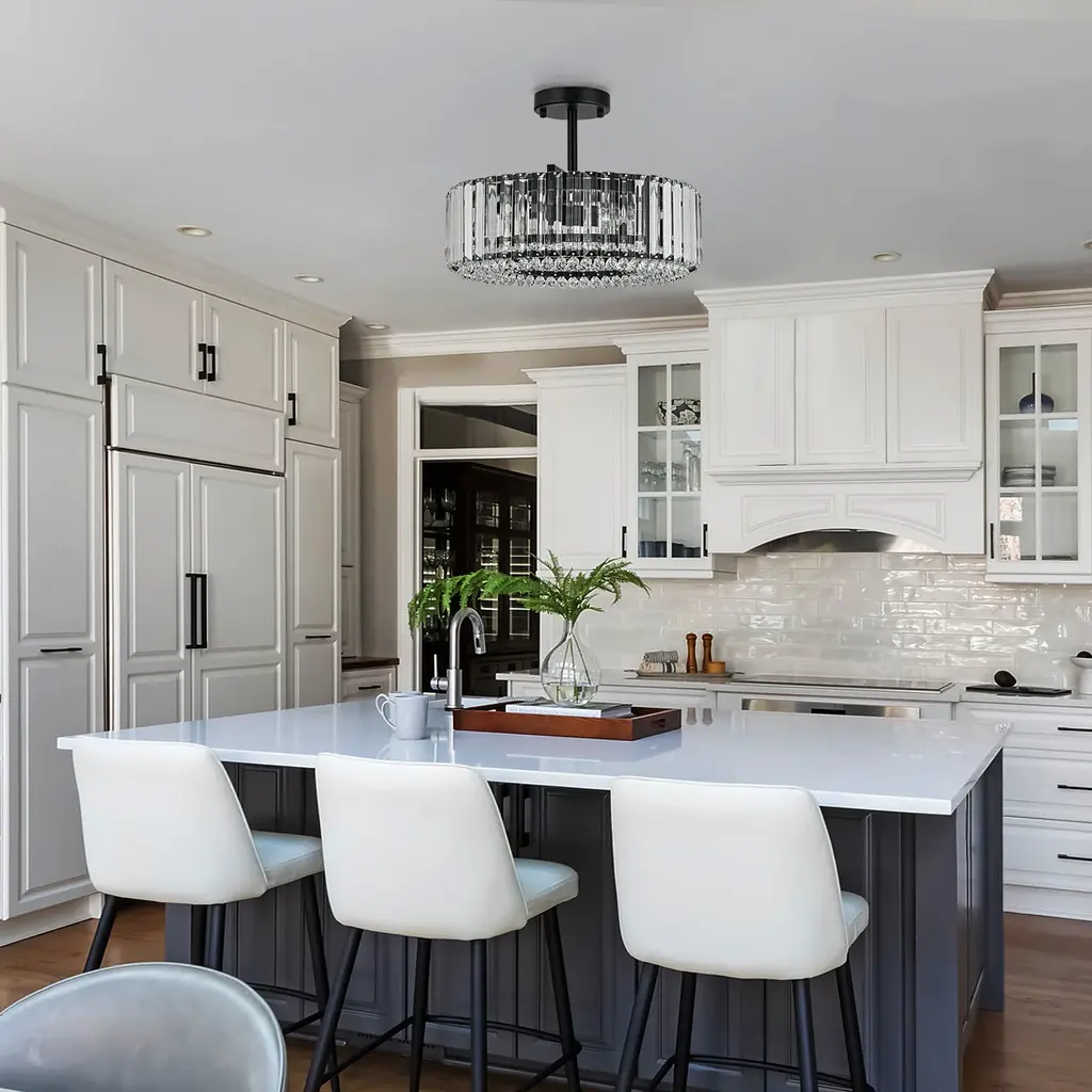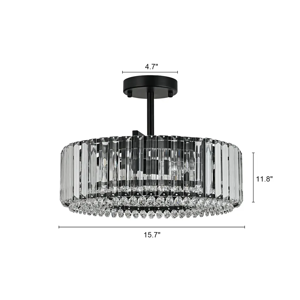 Elevate the luxury of your space to new heights with the enchanting 4-light mid-century modern crystal drum semi-flush mount light, becoming the focal point of your contemporary, modern, or glam-inspired interior. The sleek drum design adds a chic focal point to your space, and the delicate crystal prism rods and drops emanate a resplendent and opulent luminosity that casts a romantic, ethereal light and shadow upon the ceiling. This 4-light modern crystal ceiling light creates a dazzling 360-degree lighting effect that adds a touch of glamor to any room. The low-profile flush mount design fits any ceiling type.Features: Specification: Dimensions: