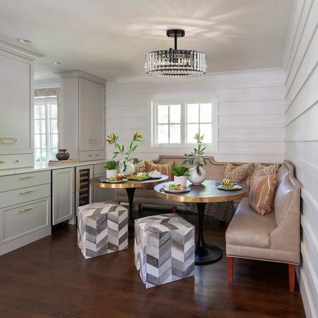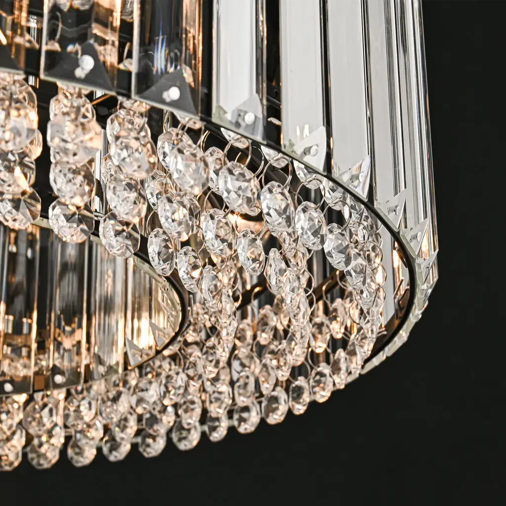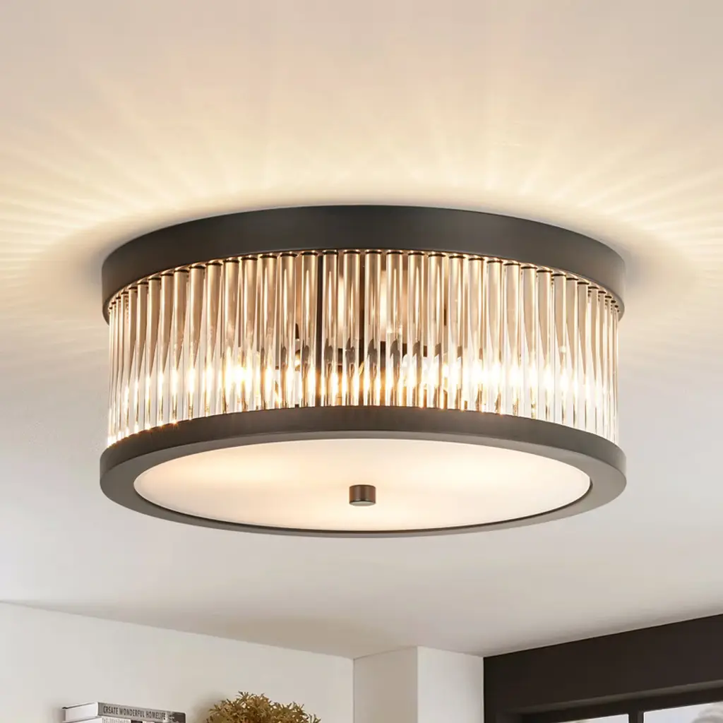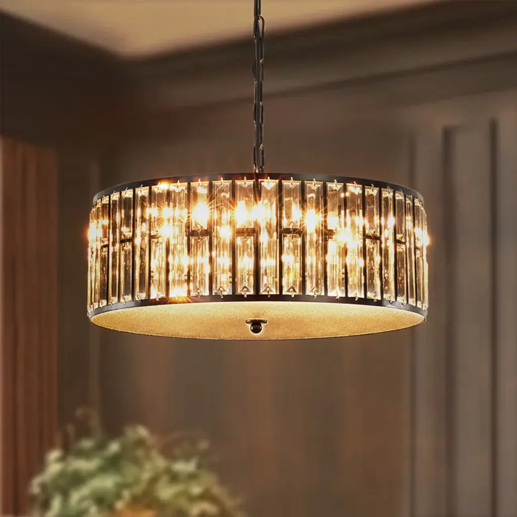 Elevate the luxury of your space to new heights with the enchanting 4-light mid-century modern crystal drum semi-flush mount light, becoming the focal point of your contemporary, modern, or glam-inspired interior. The sleek drum design adds a chic focal point to your space, and the delicate crystal prism rods and drops emanate a resplendent and opulent luminosity that casts a romantic, ethereal light and shadow upon the ceiling. This 4-light modern crystal ceiling light creates a dazzling 360-degree lighting effect that adds a touch of glamor to any room. The low-profile flush mount design fits any ceiling type.Features: Specification: Dimensions: