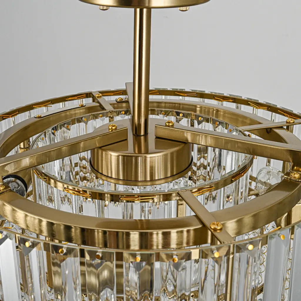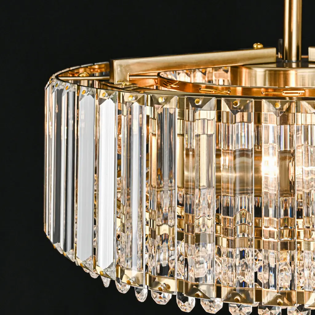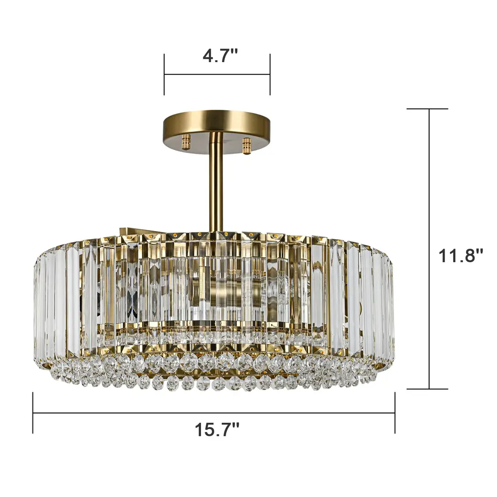 Elevate the luxury of your space to new heights with the enchanting 4-light mid-century modern crystal drum semi-flush mount light, becoming the focal point of your contemporary, modern, or glam-inspired interior. The sleek drum design adds a chic focal point to your space, and the delicate crystal prism rods and drops emanate a resplendent and opulent luminosity that casts a romantic, ethereal light and shadow upon the ceiling. This 4-light modern crystal ceiling light creates a dazzling 360-degree lighting effect that adds a touch of glamor to any room. The low-profile flush mount design fits any ceiling type.Features: Specification: Dimensions:
