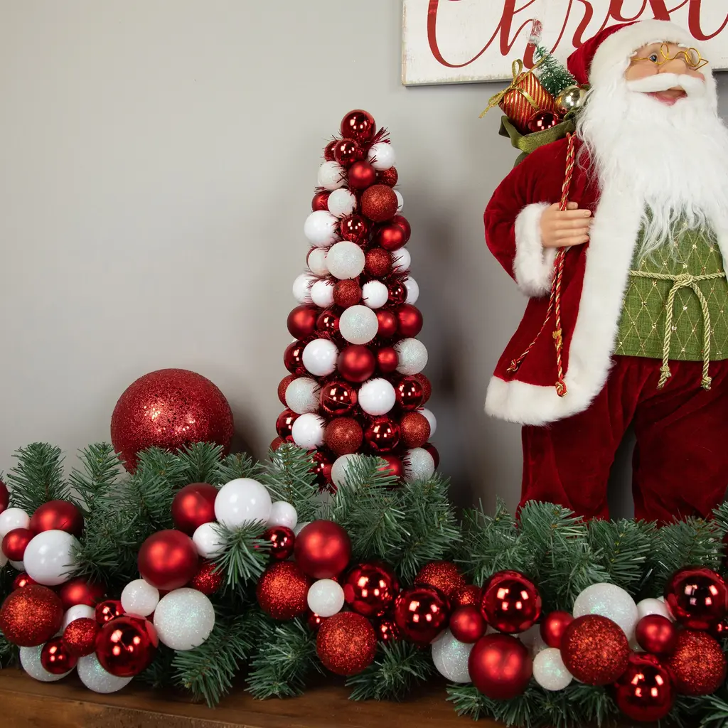 Update your Christmas decor this season with this 3-finish shatterproof ball tree. Designed with shiny, glitter and matte ball ornaments for added depth. Traditional, red tinsel is tucked in all the right places for a touch of sparkle. Shatterproof ornaments combine the beauty and luster of real glass with the unbreakable practicality of plastic. Product Features: Shatterproof ball Christmas tree Shiny, glitter and matte red and white ball ornaments Red tinsel adds sparkle Recommended or indoor use only Dimensions: 15.75"H x 7.25"W x 7.25"D Ball diameter: 1.25" and 1.5" Material(s): plastic
