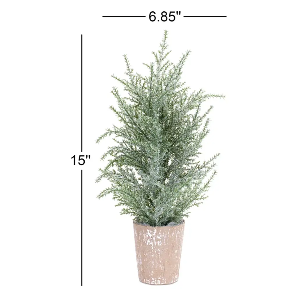 Ring in the holiday season with this beautiful set of Potted Icy Pine Trees. Featuring four pieces, this set is sure to add an elegant touch of nature to your home dcor. The varigated pine branches paired with the weathered pot base is the perfect combination to create a stunning Christmas display. Place these trees in your entryway or front porch to welcome your guests in style.