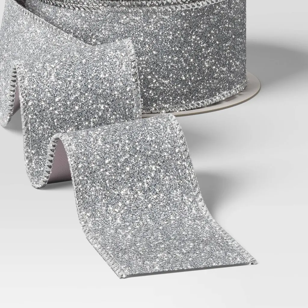 15' Christmas Premium Ribbon Silver Glitter - Wondershop™