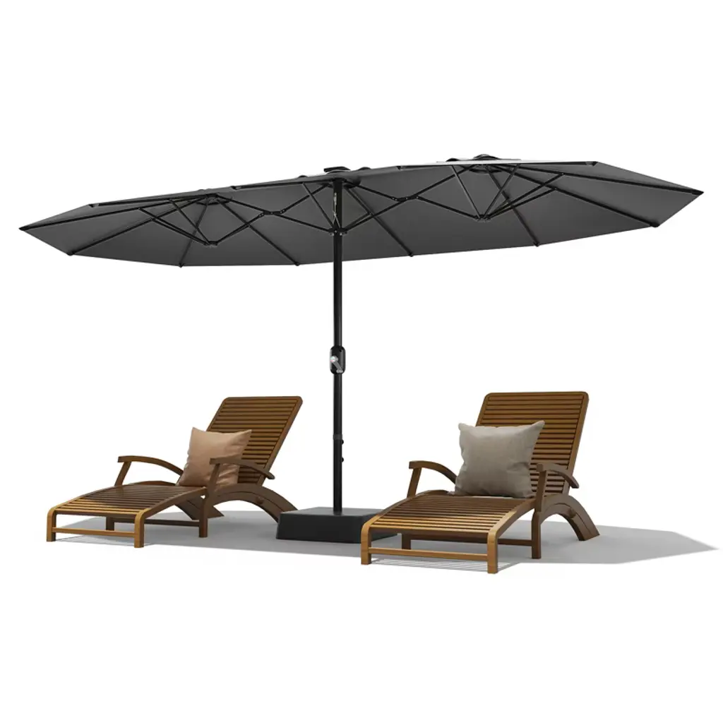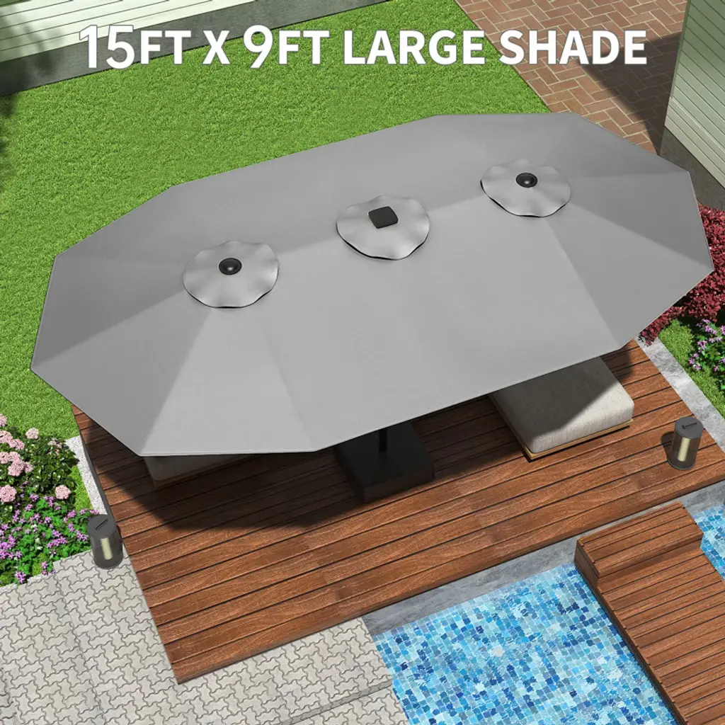 15ft Large Patio Umbrella with Base – Ultimate Outdoor Shade Solution Elevate your outdoor living with our 15ft x 9ft double-sided patio umbrella, delivering 135 sq.ft of UV-protected shade for poolsides, gardens, or backyard gatherings. Built to last with 12 rust-resistant alloy steel ribs and a powder-coated frame, it withstands wind and weather while the crank lift & tilt design ensures effortless adjustments. Includes a heavy-duty base with 2 sandbags (200 lbs total) for stability and a fade-resistant canopy backed by a 3-year durability guarantee. Perfect for homes, cafes, or beaches—upgrade your space with premium shade that blends style, safety, and convenience!